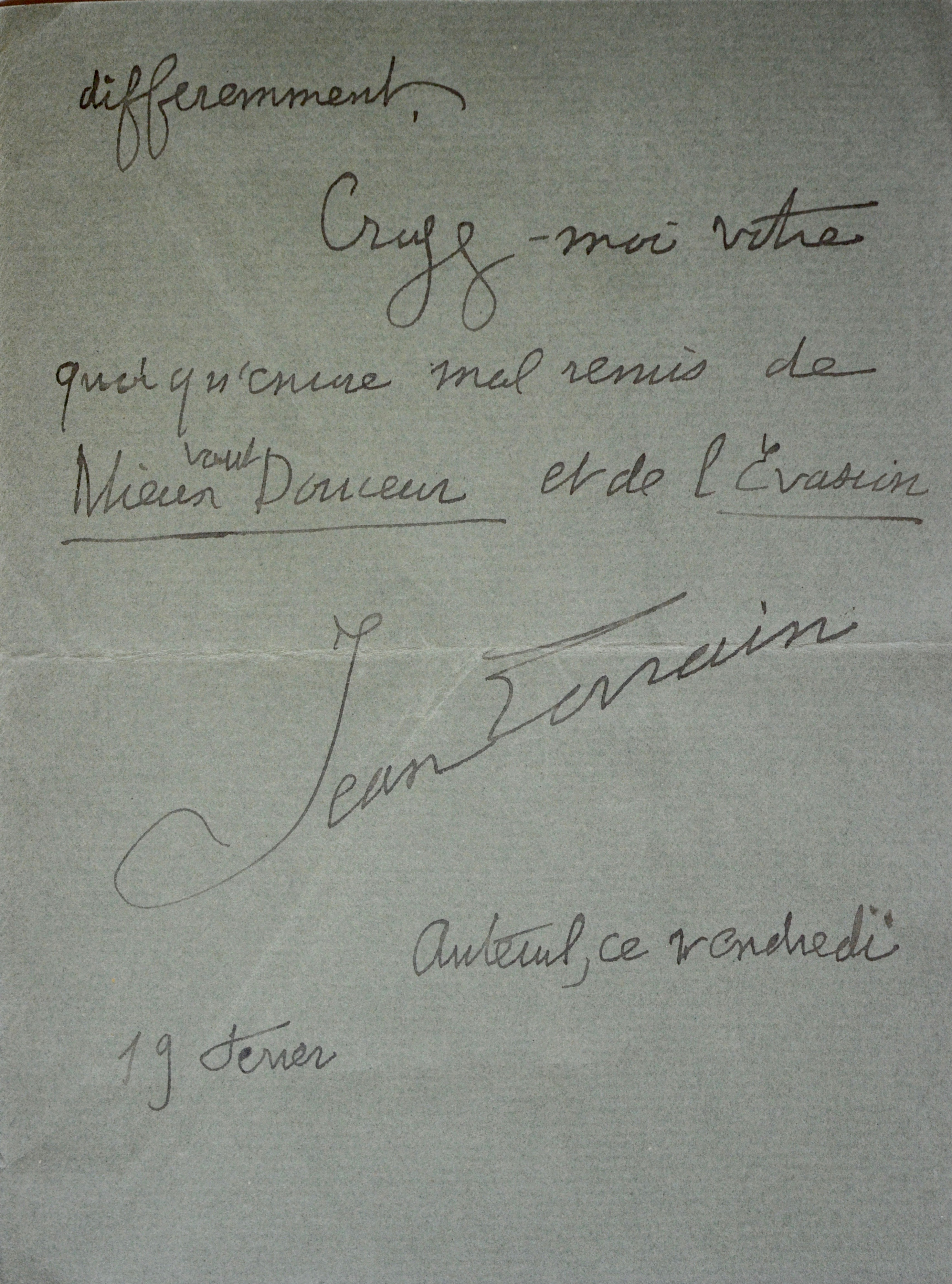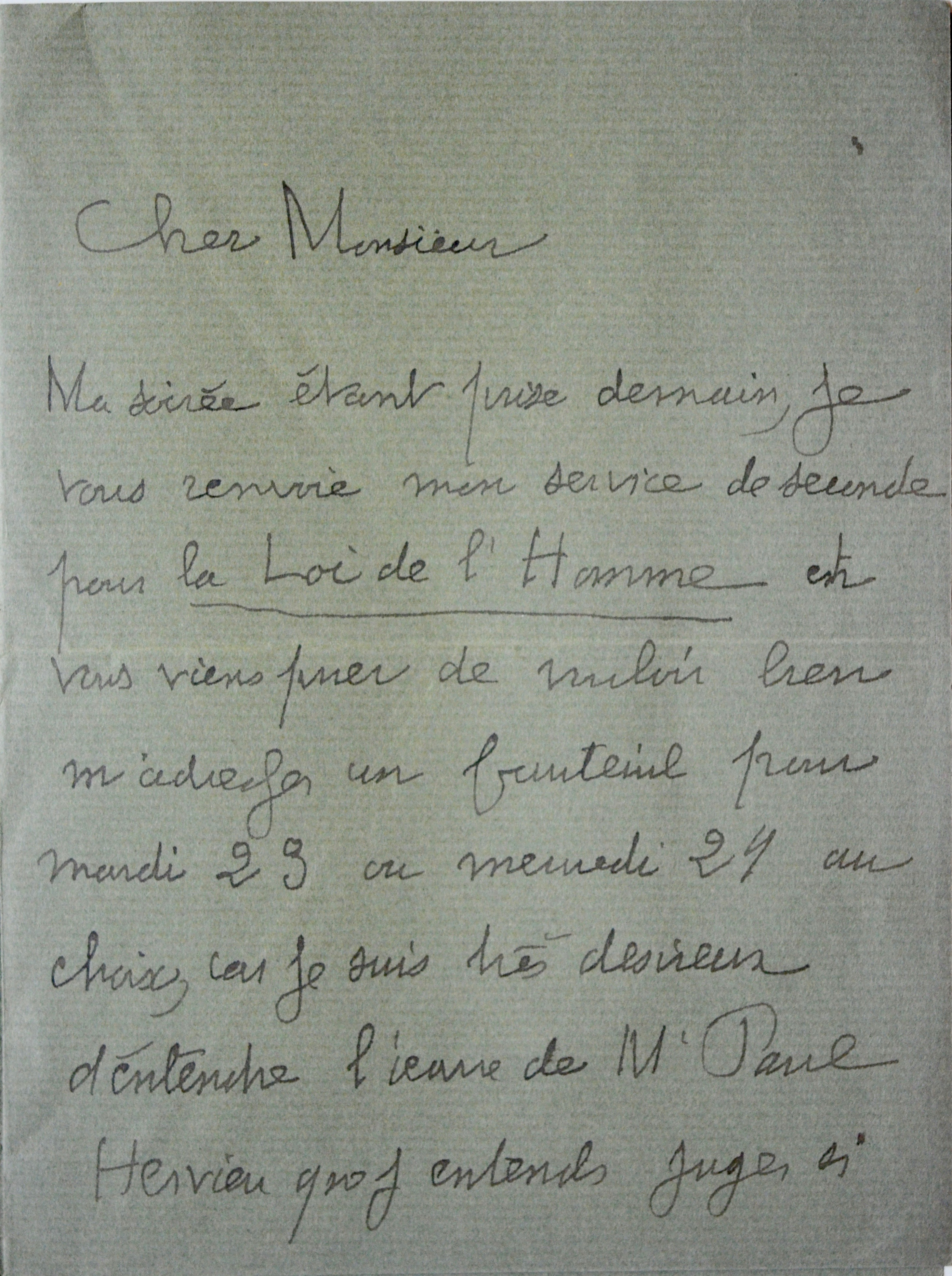 Il réclame une place à la Comédie française, pour aller voir La Loi de l'Homme, de Paul Hervieu et explique ne pas s'être encore remis des pièces Mieux vaut, douceur... et violence, d'Édouard Pailleron et L'Évasion d'Eugène Brieux, jouées au même endroit. "[...] Ma soirée étant prise, je vous renvoie mon service de seconde pour la Loi de l'Homme et vous vient prier de vouloir bien m'adresser un fauteuil pour mardi 23 ou mercredi 24 au choix car je suis très désireux d'entendre l'oeuvre de M. Paul Hervieu que j'entends juger si différemment. Croyez-moi quoi qu'encore mal remis de Mieux vaut Douceur et de l'Evasion [...]". (19/02/1897).