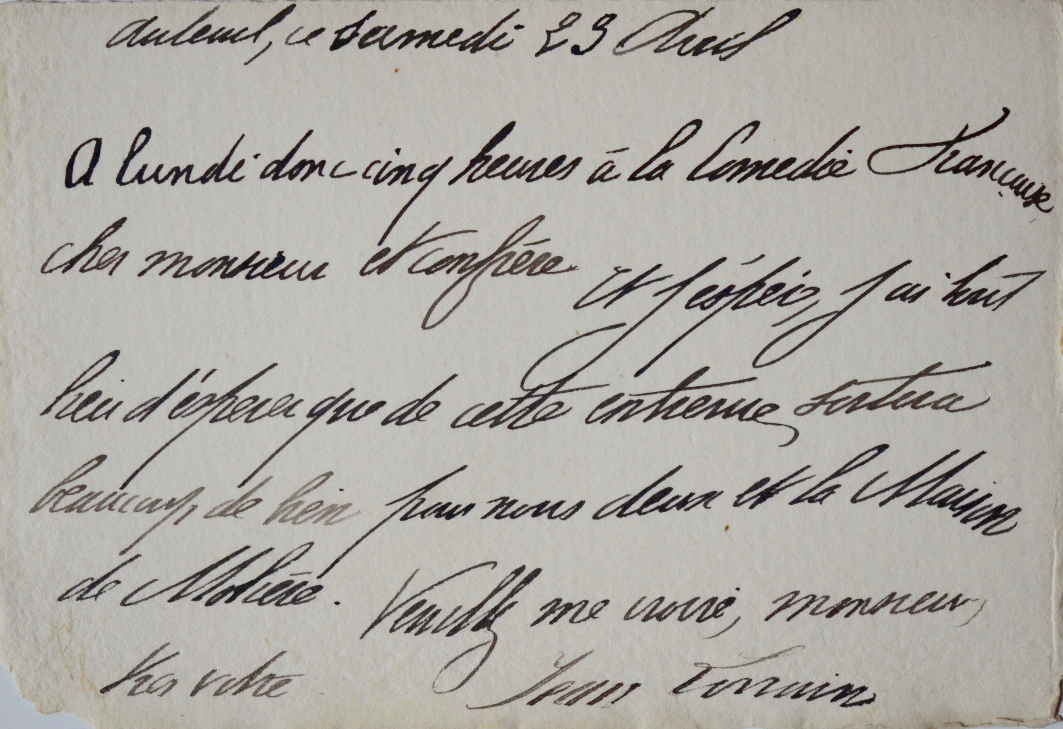 "[...] A lundi donc cinq heures à la Comédie française cher Monsieur et confrère et j'espère, j'ai bien lieu d'espérer que de cette entrevue sortira beaucoup de bien pour nous deux et la maison de Molière [...]".