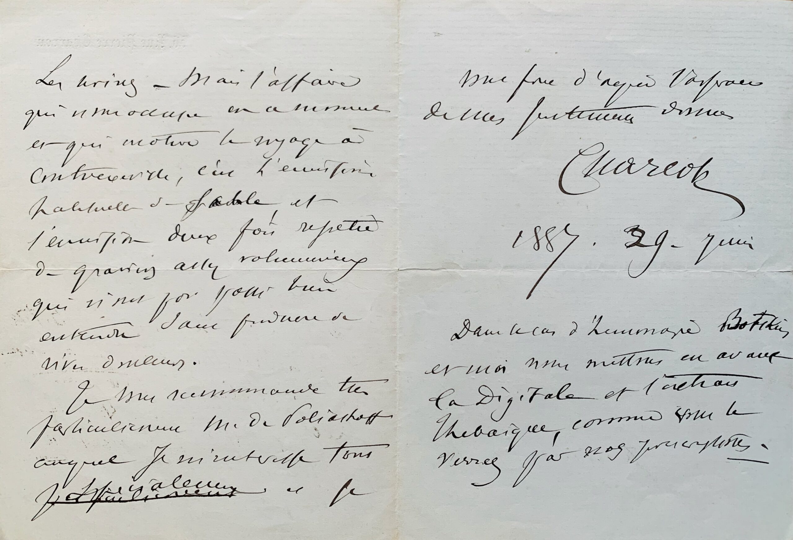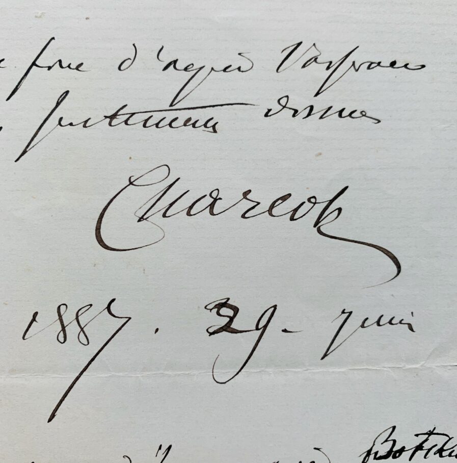 Je vous recommande très particulièrement M. de Poliakoff auquel je m’intéresse tout spécialement et je vous prie d’agréer l’assurance de mes sentiments dévoués. Charcot. 1887 29 juin.