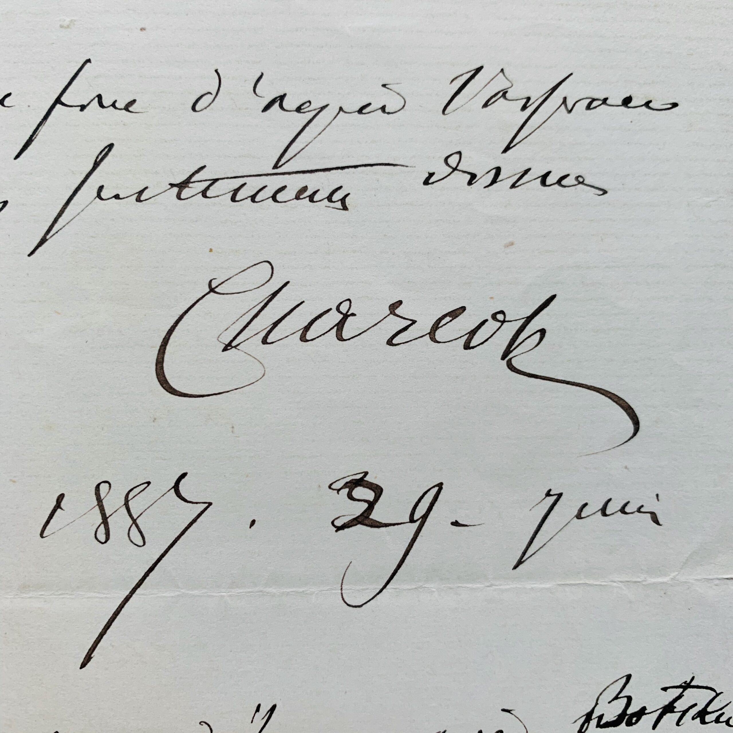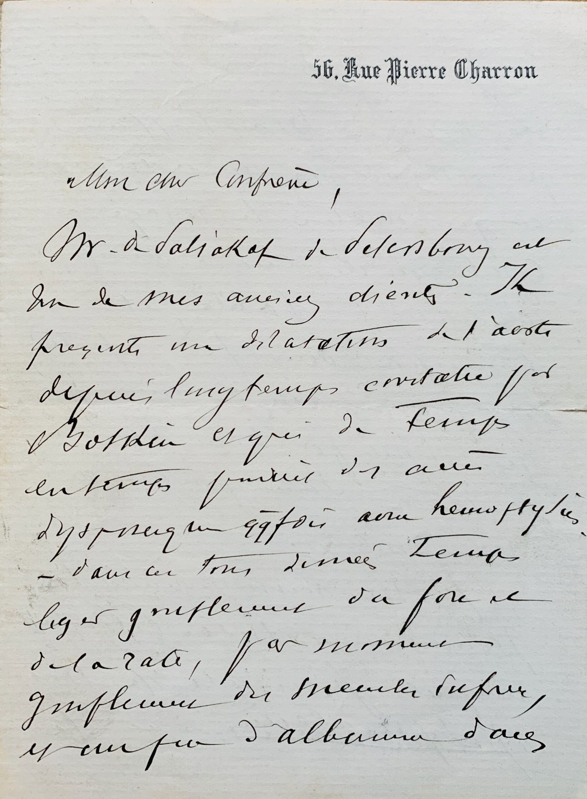Jean-Martin Charcot (Paris, 1825/1893)Jean-Martin Charcot sollicite l'aide d'un de ses confrères [possiblement le médecin Adolphe Thierry, découvreur de la source minérale de Contrexéville] pour soigner un patient de l'aristocratie russe, souffrant d'une dilatation de l'aorte et d'importants calculs rénaux.
