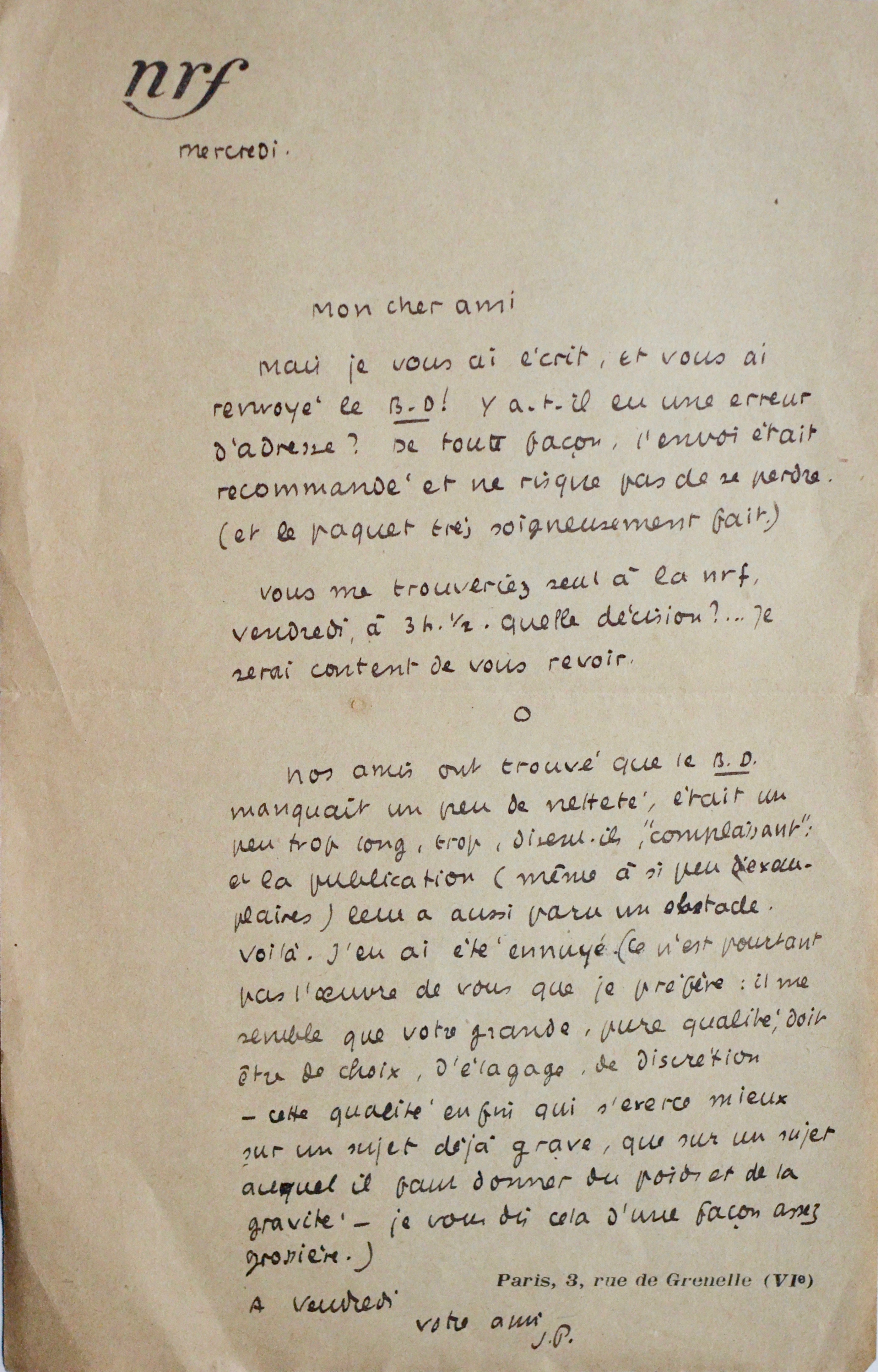 Paulhan adresse à son ami un colis, très soigneusement fait, avec ces mots : "Je vous ai écrit, et vous ai renvoyé le B-D ! [...] Nos amis ont trouvé que le B.D. manquait un peu de netteté, était un peu trop long, trop, disent-ils, "complaisant" et la publication (même à si peu d'exemplaire) leur a aussi paru un obstacle. Voilà. J'en ai été ennuyé (ce n'est pourtant pas l'oeuvre de vous que je préfère : il me semble que votre grande, pure qualité, doit être de choix, d'élagage, de discrétion - cette qualité enfin qui s'exerce mieux sur un sujet déjà grave, que sur un sujet auquel il faut donner du poids et de la gravité [...]".
