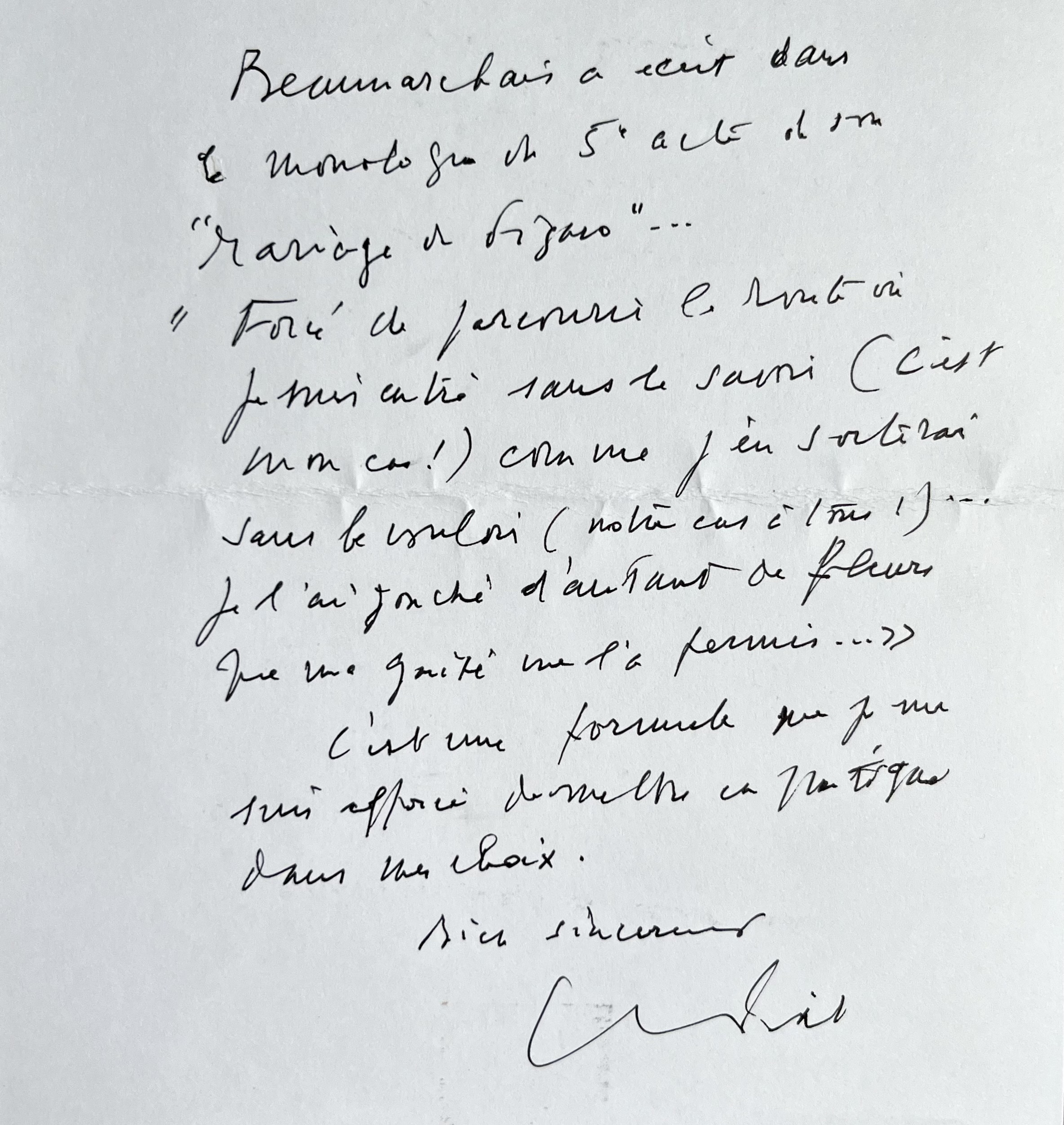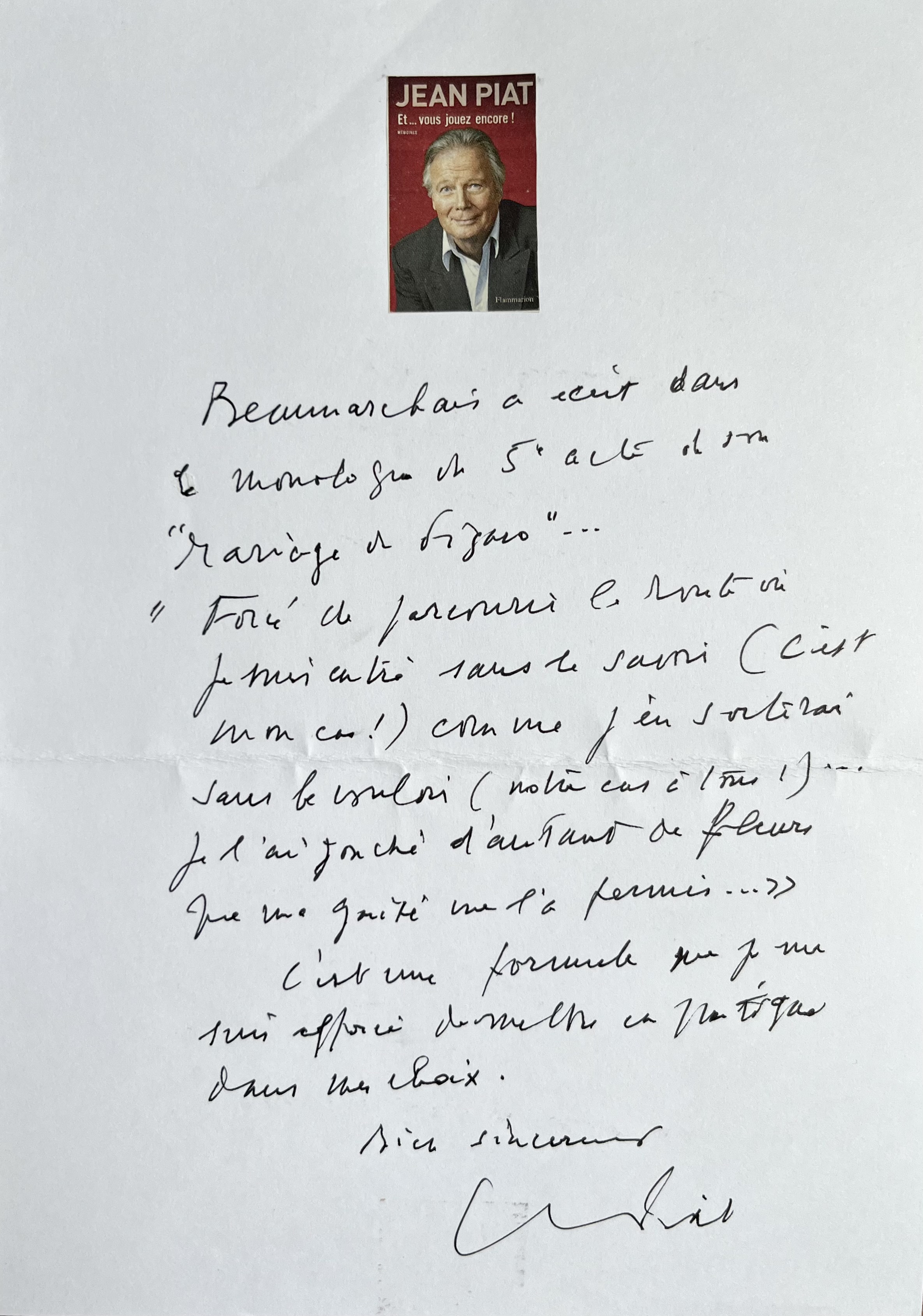Belle citation de Beaumarchais copiée et commentée par Jean Piat, sociétaire de la Comédie française, sur un bristol sur lequel a été collé un portrait photographique de Piat tiré d'un magazine :