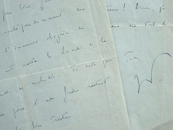 Jean-Pierre Aumont (Paris, 1911/2001)Jean-Pierre Aumont, mobilisé au front, annonce une triste nouvelle à celle qui fut sa partenaire dans plusieurs films de Jacques Tourneur, Yves Allégret ou Victor Tourjansky. «J'ai eu l'immense chagrin de perdre maman. Elle est morte le lundi de la Pentecôte après 5 mois de maladie. Tu sais que je l'adorais. Mon père et mon frère restent tout seuls. C'est bien bien triste». Il évoque ensuite sa vie au front. «J'ai rejoint ma division qui se trouve quelque part au Nord-Est, et je ne me plains pas, car nous vivons en pleine nature, campant dans les fermes ou les forêts ; et c'est une vie que j'aime de plus en plus. Je pense qu'après la guerre, plutôt que de jouer les pères nobles ou les comiques troupiers, je me ferai gentleman-farmer. Le moral des gens est admirable ici et chacun fait son devoir avec entrain et optimisme [...]». Il lui apprend qu'il est le subordonné de Jacques Pills [le chanteur, époux de Lucienne Boyer, qui se remariera avec Edith Piaf]. «Nous nous adorons, naturellement. Heureusement, tu fus toujours vertueuse ! Sinon, je craindrais de trouver de tes amoureux sur toute la ligne de front».