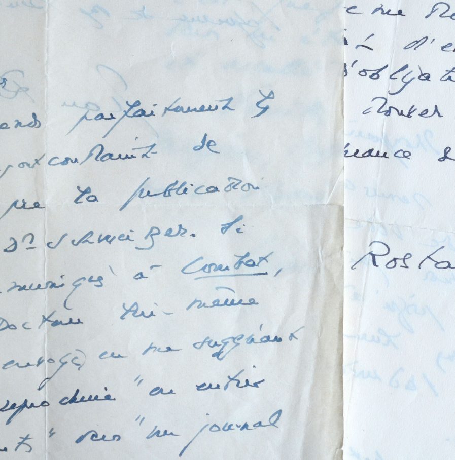 Une première lettre est consacrée à la publication de textes d'Albert Schweitzer. "Je comprends parfaitement les raisons qui vous ont contraint de faire interrompre la publication des textes du Dr Schweitzer. Si je les ai communiqués à Combat, c'est que le Docteur lui-même me les avait envoyés en me suggérant de les faire reproduire "en entier ou en fragment" dans "un journal ou une revue". J'ignorais d'ailleurs que ces textes pussent être réunis en un volume". La seconde lettre concerne sa préface à un livre de Jacques Chardonne [Le Ciel dans la fenêtre]. "C'est moi qui suis heureux et honoré jusqu'à en être confus, de voir mes humbles pages en tête de l'admirable livre de Chardonne [...]".