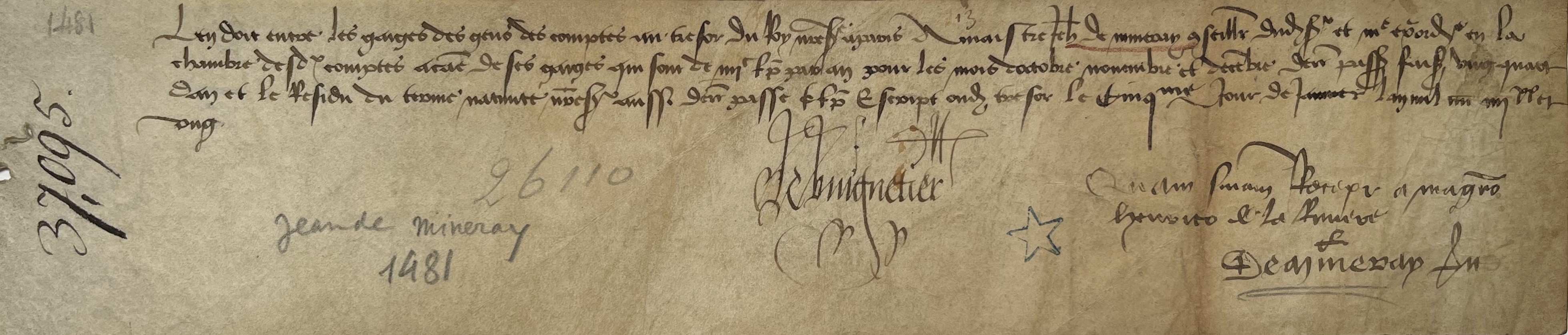 "Lon doit entre les gaiges des gens des comptes au trésor du Roy nostre seigneur à Paris, à maistre Jeh. de Mineray conseiller dudit seigneur et maistre extraordinaire en la chambre de desdits comptes à cause de ses gaiges qui sont de iiiic lp [400 livres parisis] par an pour les mois d'octobre novembre et decembre dernièrement passés faisant ung quart dan et le résidu du terme [...]".