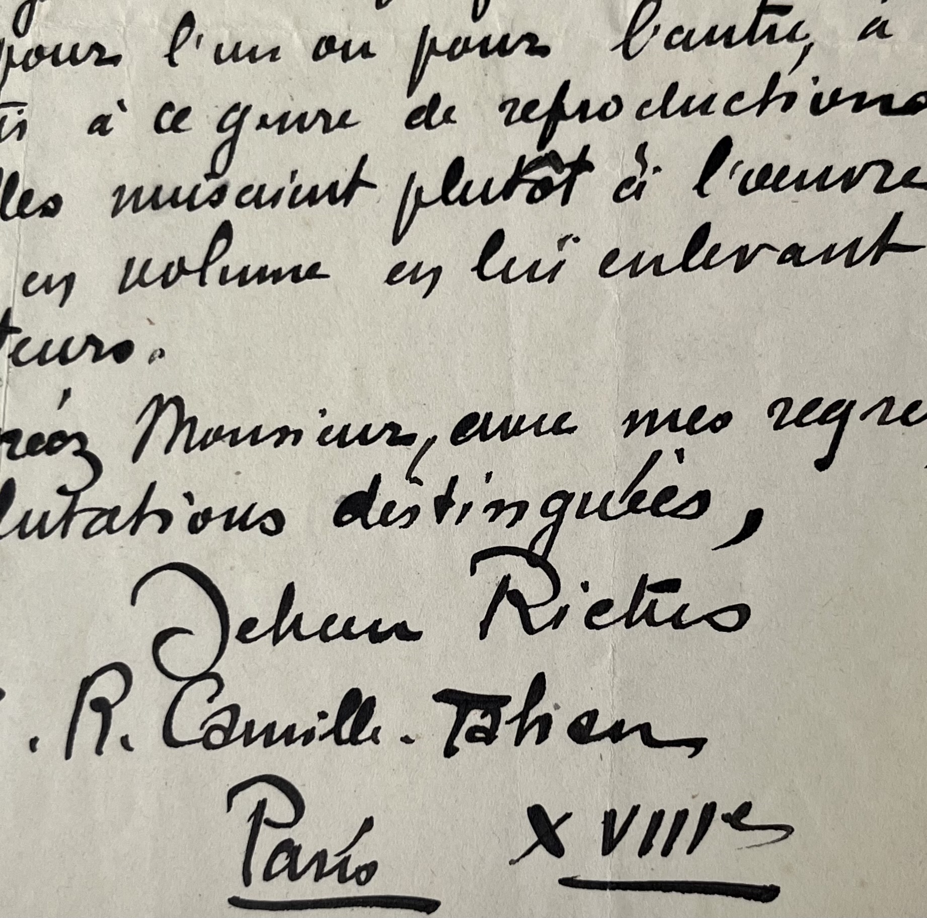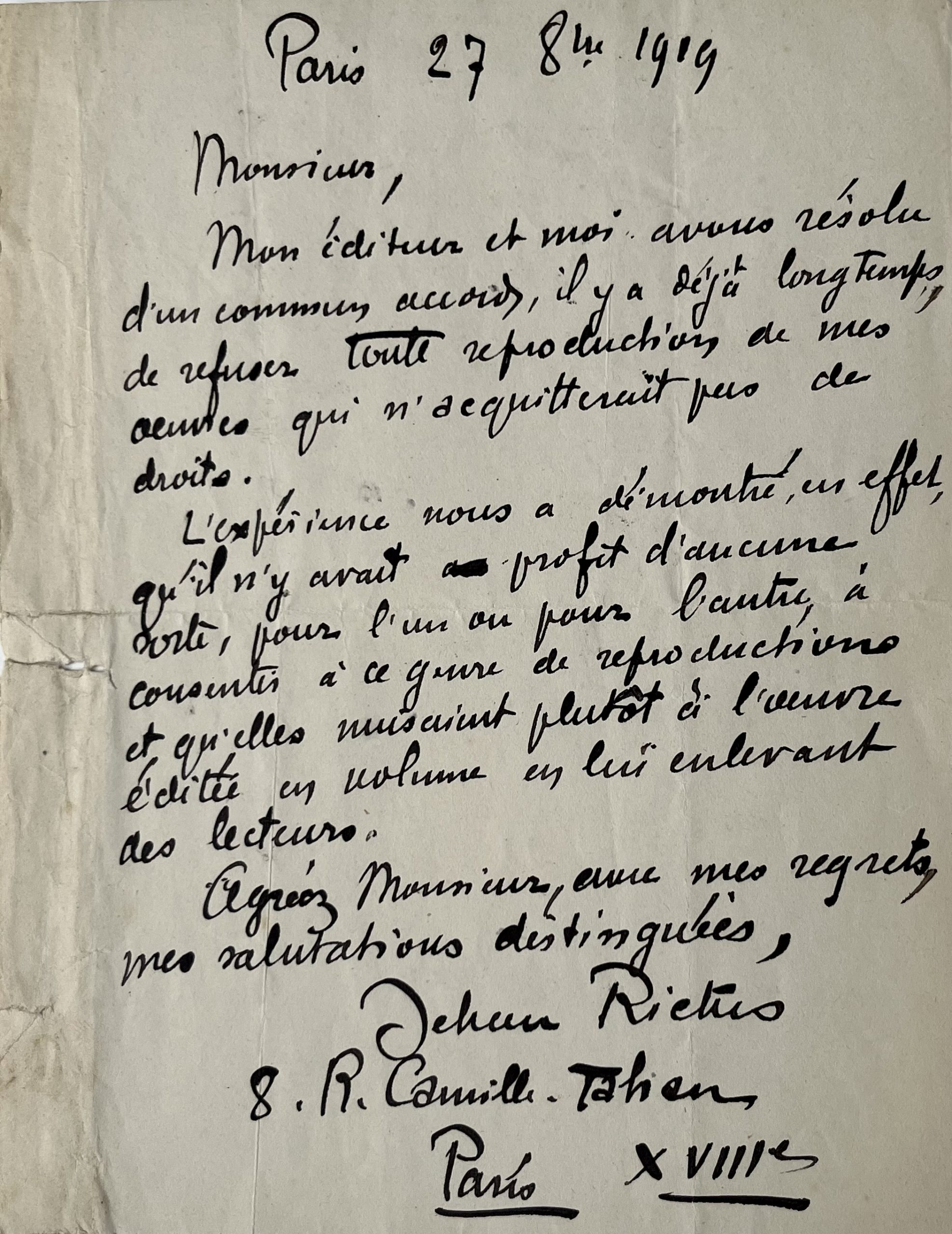 "Mon éditeur et moi avons résolu d'un commun accord, il y a déjà longtemps, de refuser toute reproduction de mes œuvres qui n'acquitterait pas de droits. L'expérience nous a démontré, en effet, qu'il n'y avait profit d'aucune sorte, pour l'un ou pour l'autre, à consentir à ce genre de reproductions et qu'elles nuisaient plutôt à l'œuvre éditée en volume en lui enlevant des lecteurs".