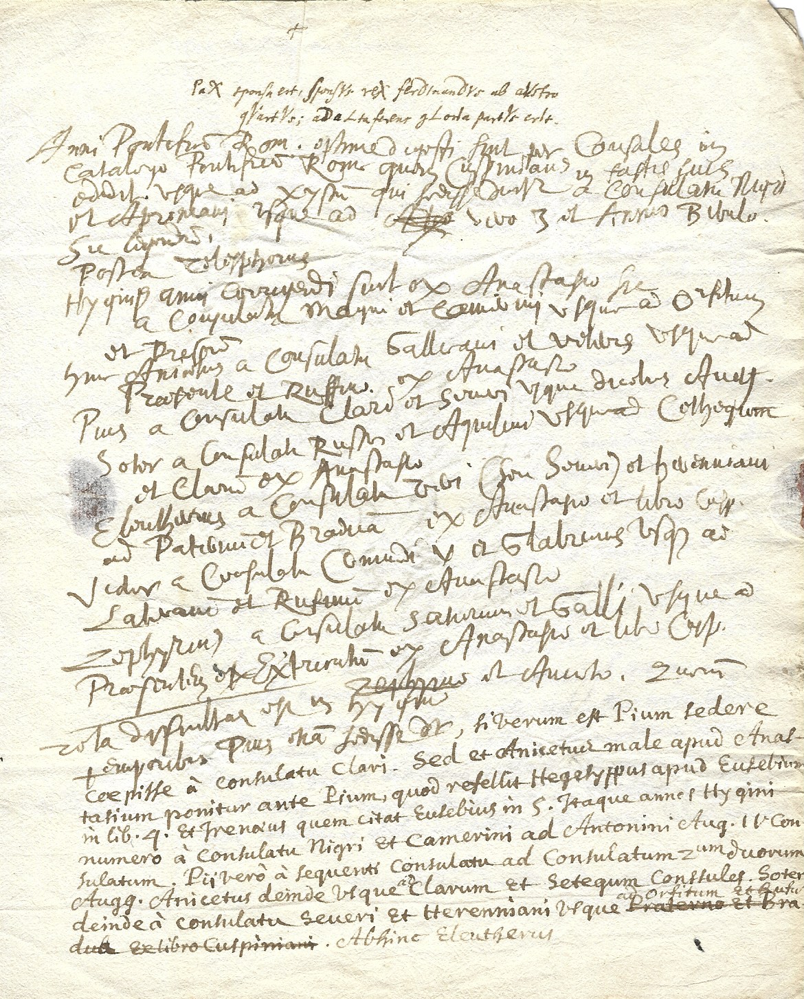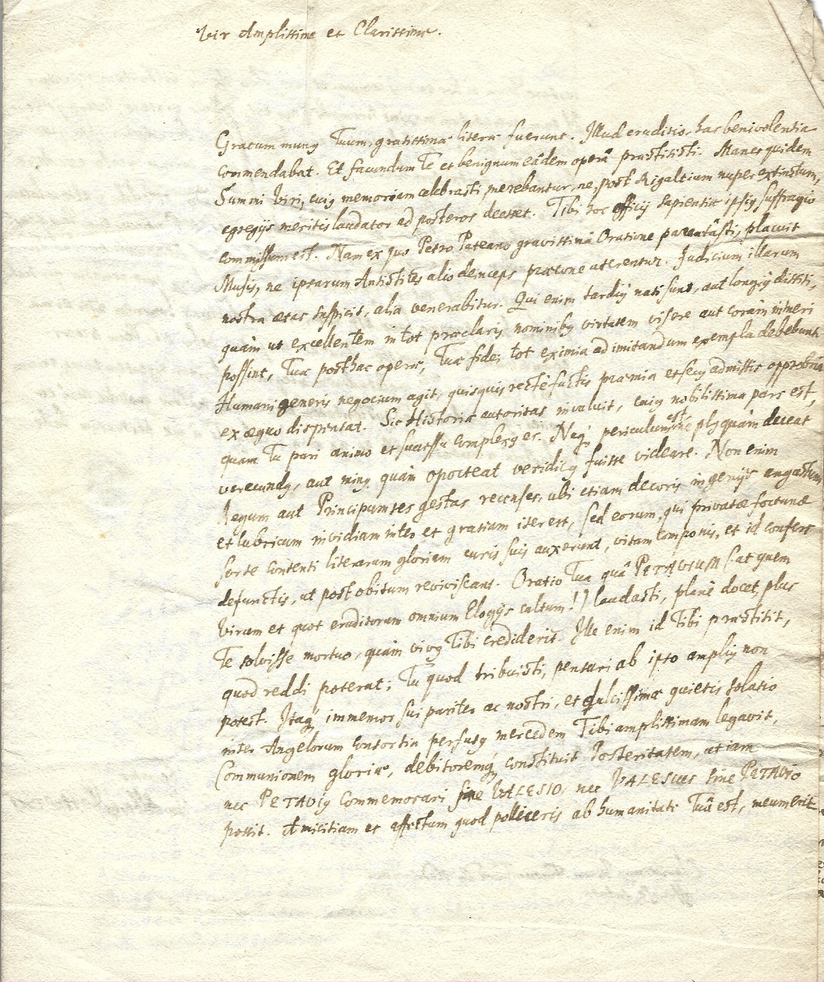 La promesse d'amitié et d'affection que vous me faites provient de votre humanité et je serai en compétition avec vous sur ce terrain pour remporter cette seule victoire sur vous. [...] Chez nous la littérature est muette et Mars sonnant la trompette guerrière, elle reste sans paroles. Je ne compte pour rien le discours pour le Roi Ferdinand et je mets de côté le Chronostichon qui seul est digne de vos oreilles. O puissent avec la paix, les arts de la paix nous revenir ! et que la paresse ne cor-rompe plus la République et les études. Mais par nature les remèdes à l'infirmité humaine sont trop lents. Votre gloire propre est d'avoir conservé intact l'honneur de la science au milieu des guerres même civiles. Je prie Dieu qu'elle soit éternelle. Je vous souhaite, illustre Valois, une pleine santé, une gloire et un esprit en pleine force, à vous qui mettez chaque jour davantage votre soin et votre application à élever des monuments pour la postérité. Adieu et aimez-moi, persuadé de mon atta-chement envers vous."
