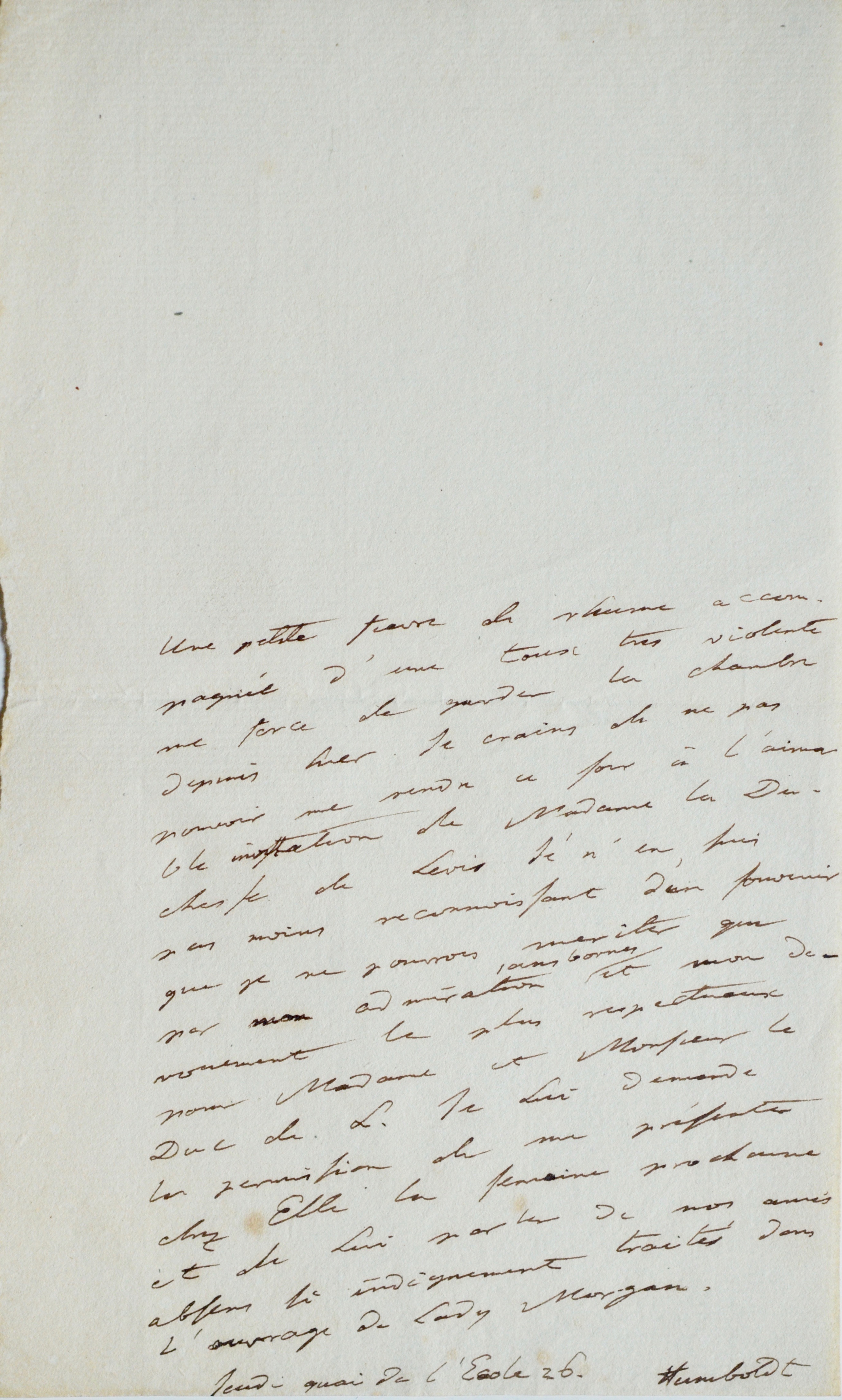 Lettre autographe signée du naturaliste et explorateur Alexander von Humboldt, adressée à la duchesse de Lévis.