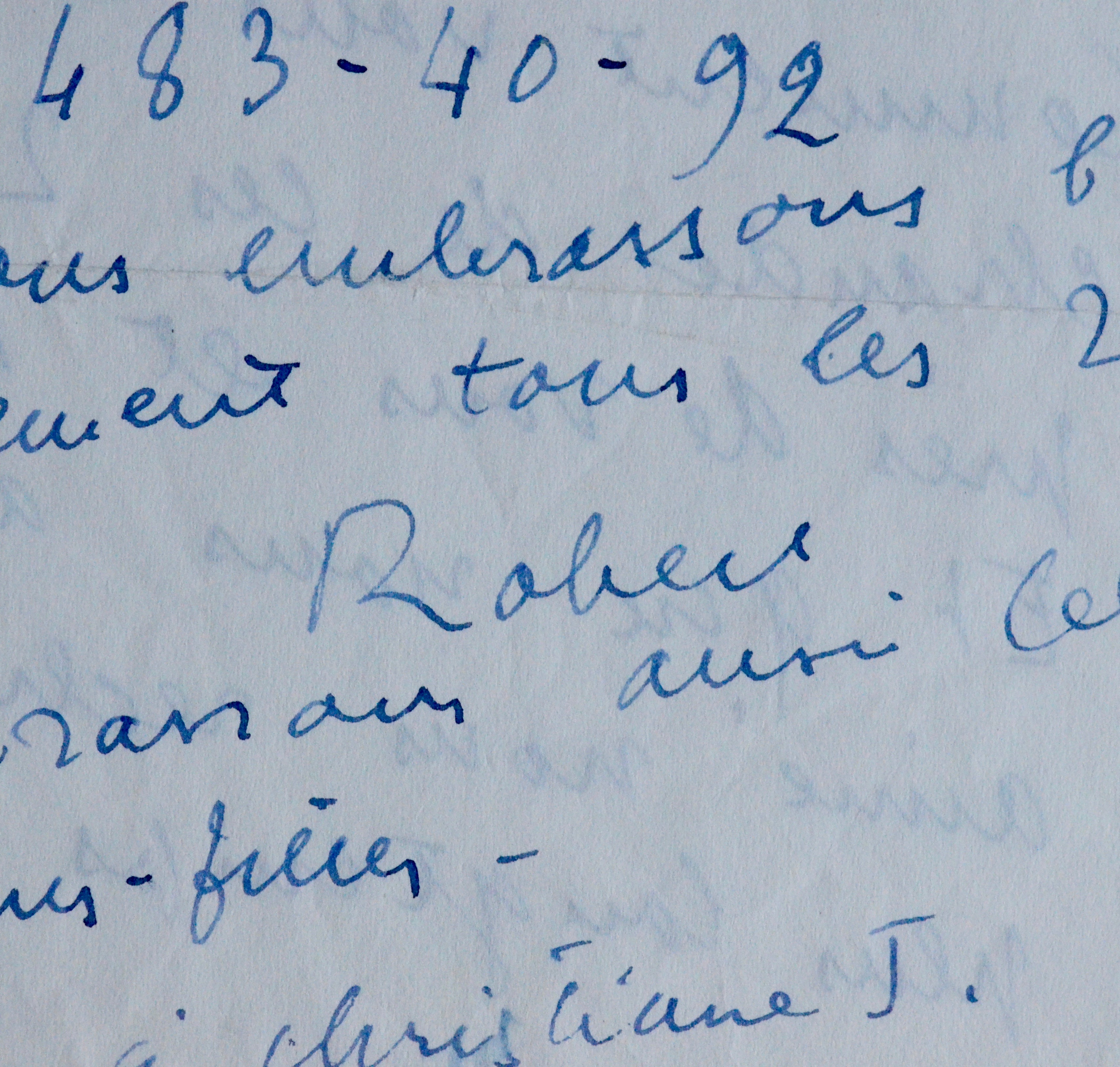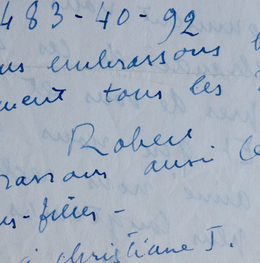 Robert Bresson demande à Micheline Delamain un service concernant un vêtement oublié. "[...] Comment vous dire la joie chaude de ces 24 heures près de vous et Maurice ? Et que nous aurions aimé nous réchauffer plus longtemps encore ! Le roulage a été rapide malgré des fautes aux changements de routes, et 1 heure 1/2 pour passer le Gois (espèce de place de la Concorde sur 10 kilomètres) [...]".