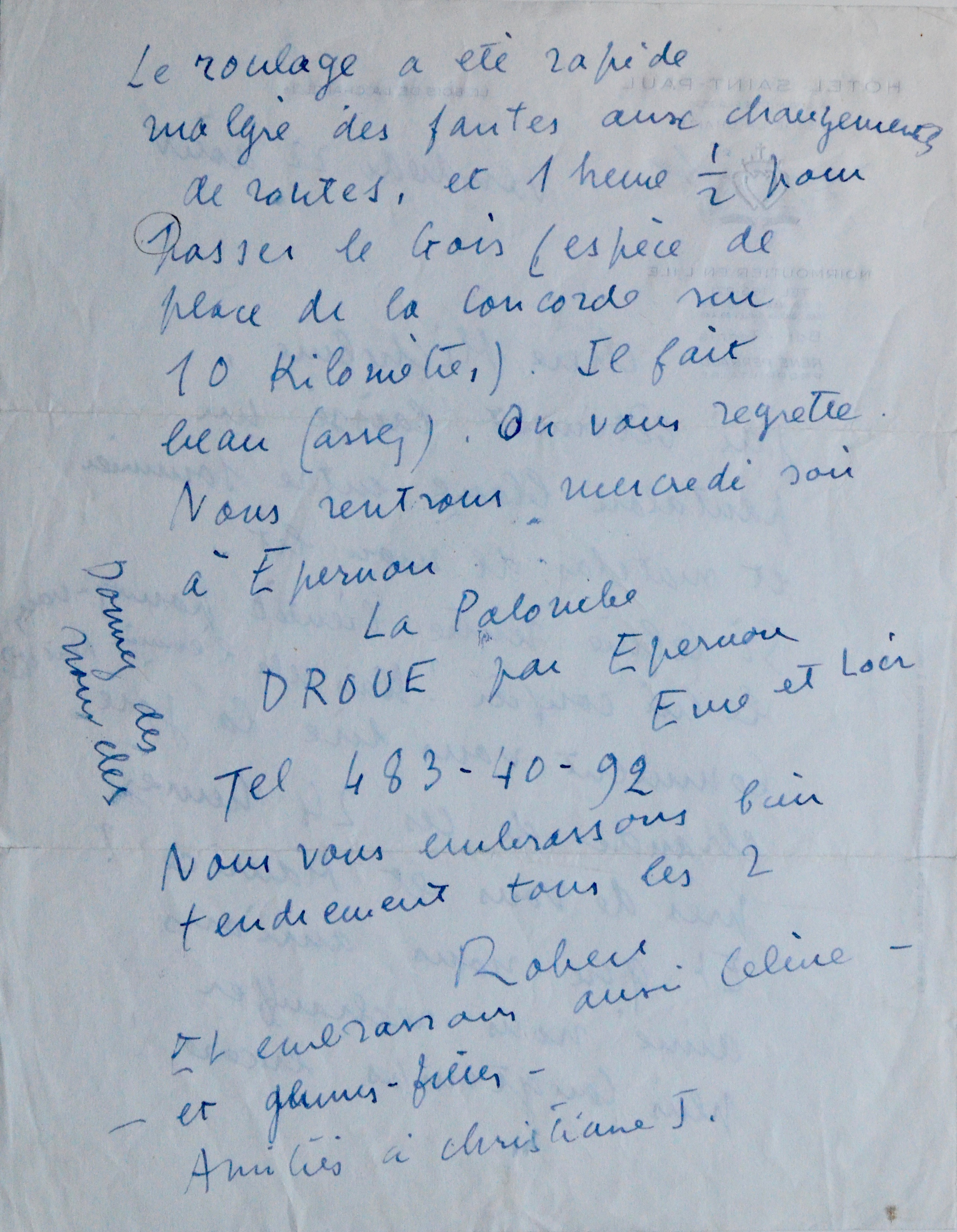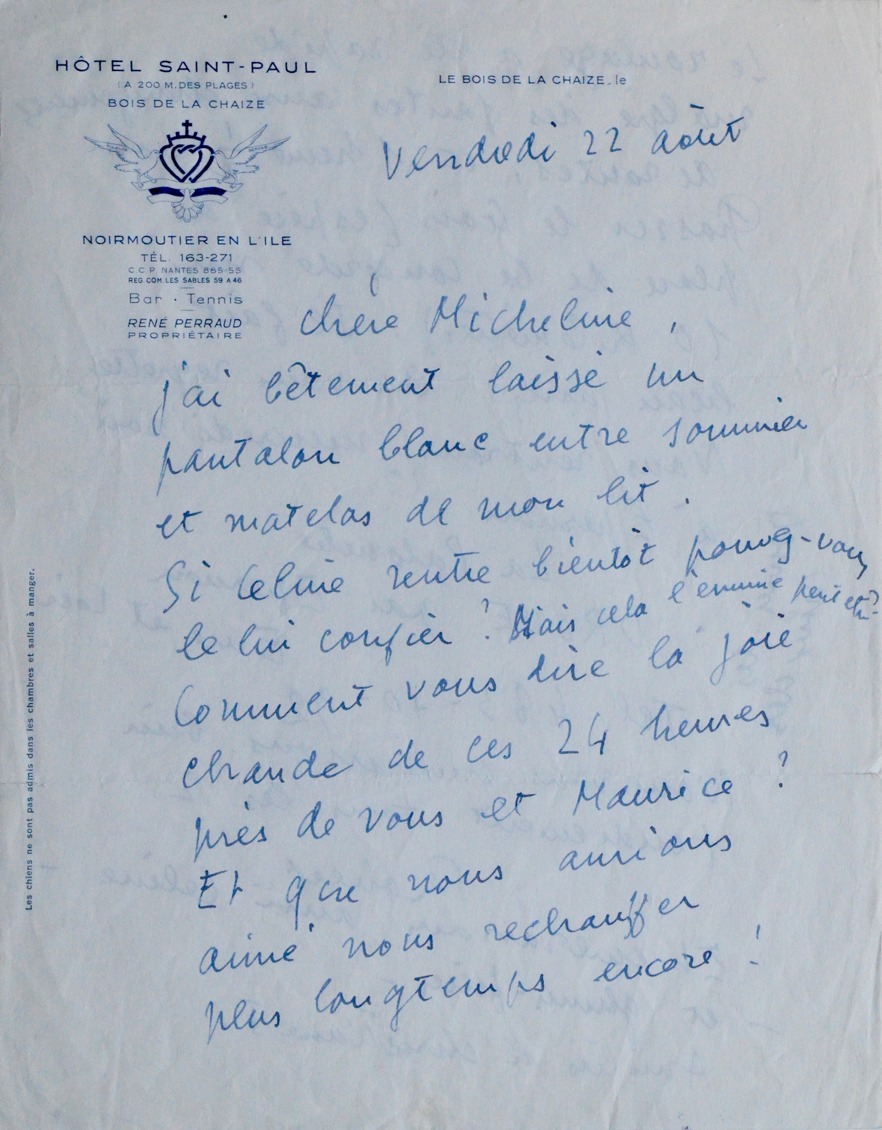 Encre bleue sur papier filigrané. En-tête de l'Hôtel Saint-Paul de Noirmoutier.