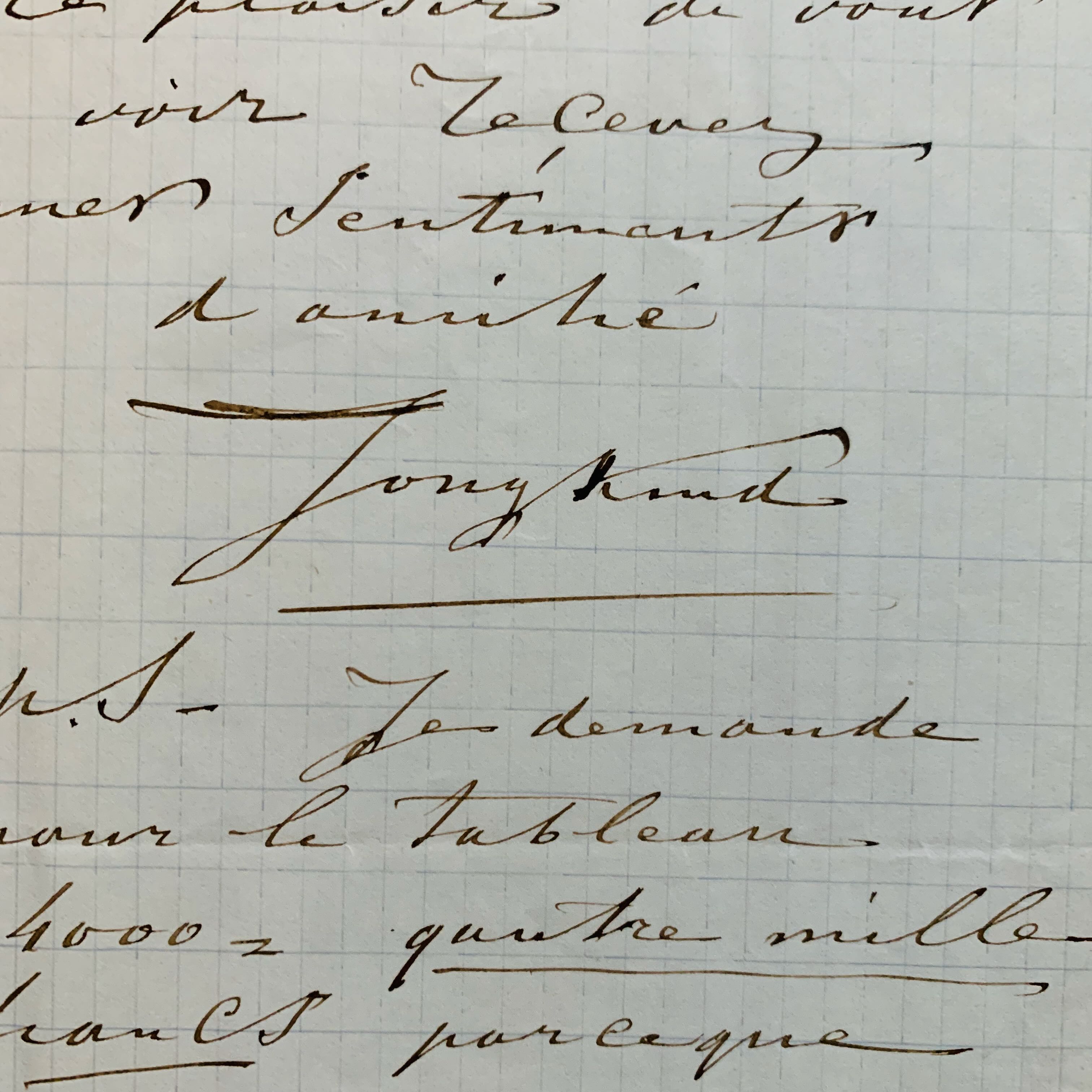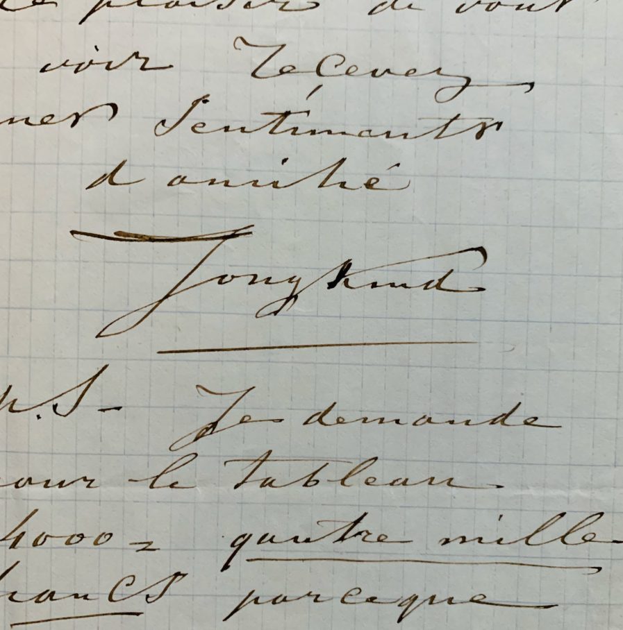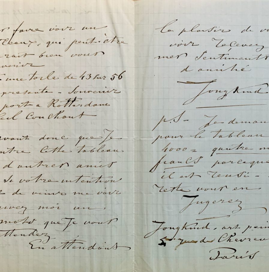 "Maintenant je vous écris et après une longue absence de tant d'années étant de retour à Paris que je voudrais bien vous fair avoir un tableau, qui peut-être pourra bien vous convenir. C'est une toile de 43 sur 56 et représente - souvenir d'un port à Rotterdam soleil couchant. Avant donc que je montre cette tableau à d'autres amis et de votre intention est de venir me voir [...]. Je demande pour le tableau 4000 = quatre mille francs parce que il est réussi - du reste vous en jugerez [...]".