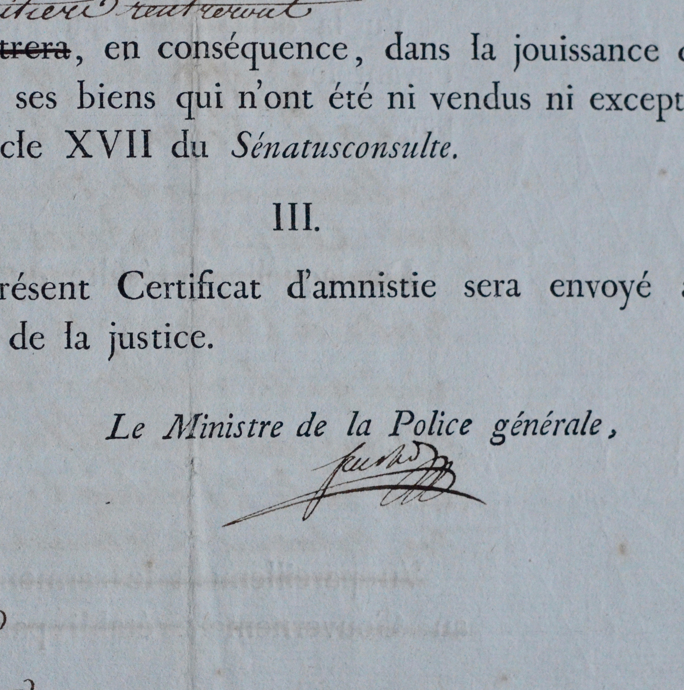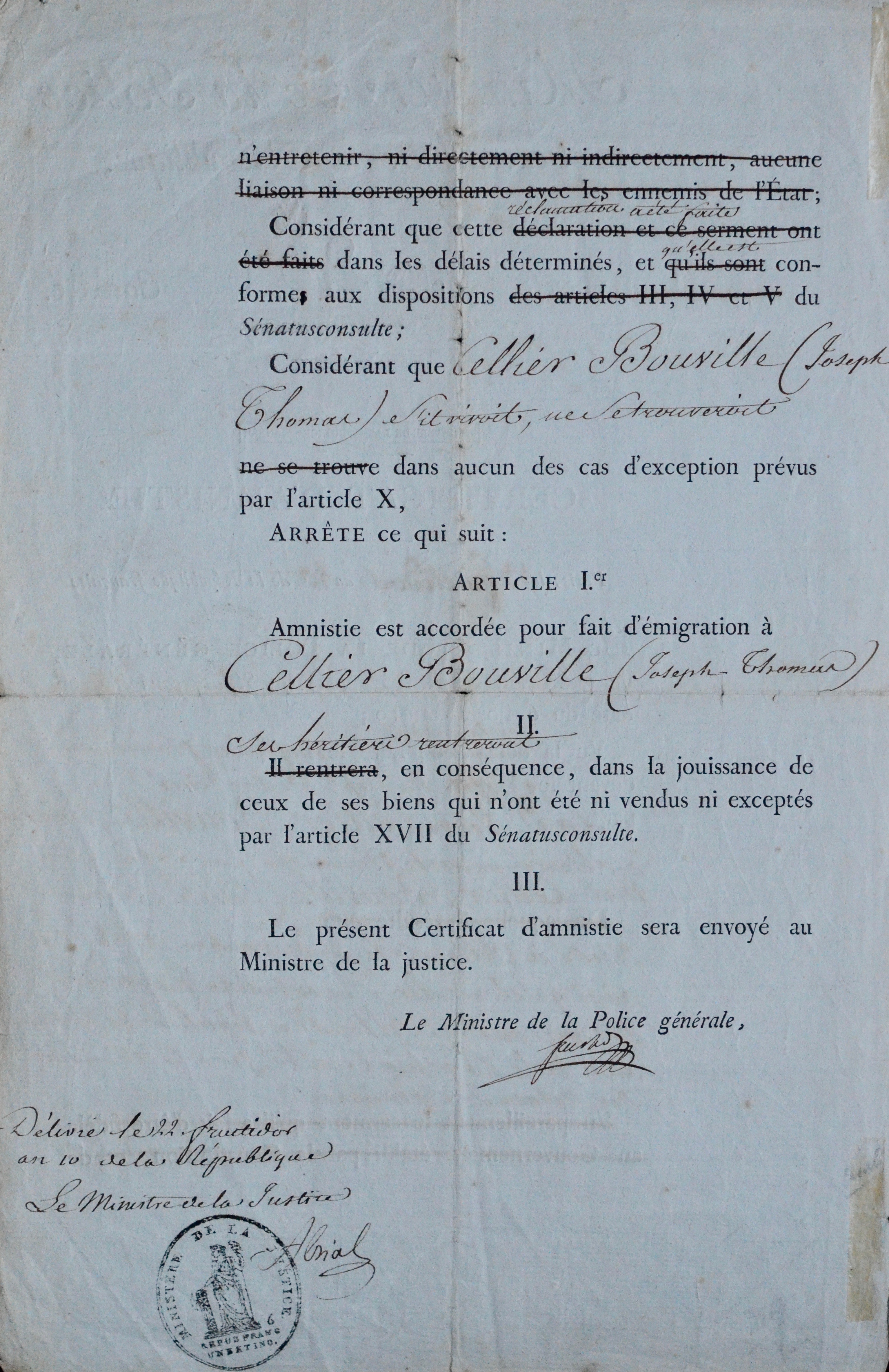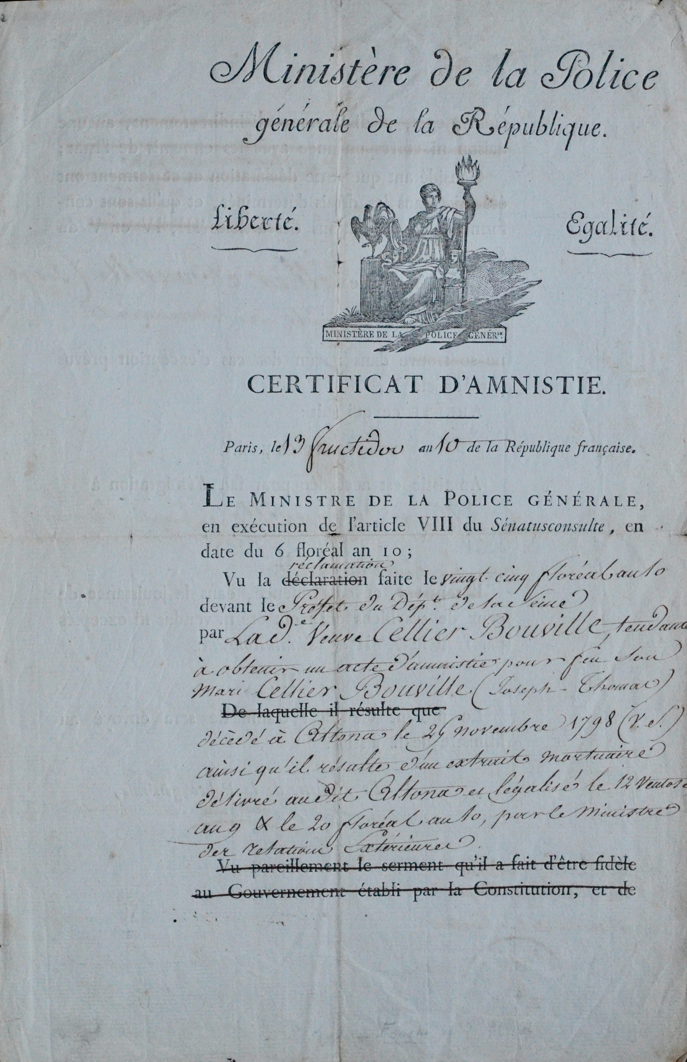 Certificat d'amnistie délivré par Joseph Fouché à la veuve de feu Joseph Thomas Cellier de Bouville (1766-1798) "décédé à Altona le 25 novembre 1798 [...]". Amnistie est accordée pour fait d'émigration, à titre posthume, à Cellier Bouville (Joseph-Thomas). "Ses héritiers rentreront, en conséquence, dans la jouissance de ceux de ses biens qui n'ont été ni vendus ni exceptés par l'article XVII du Sénatusconsulte [...]".