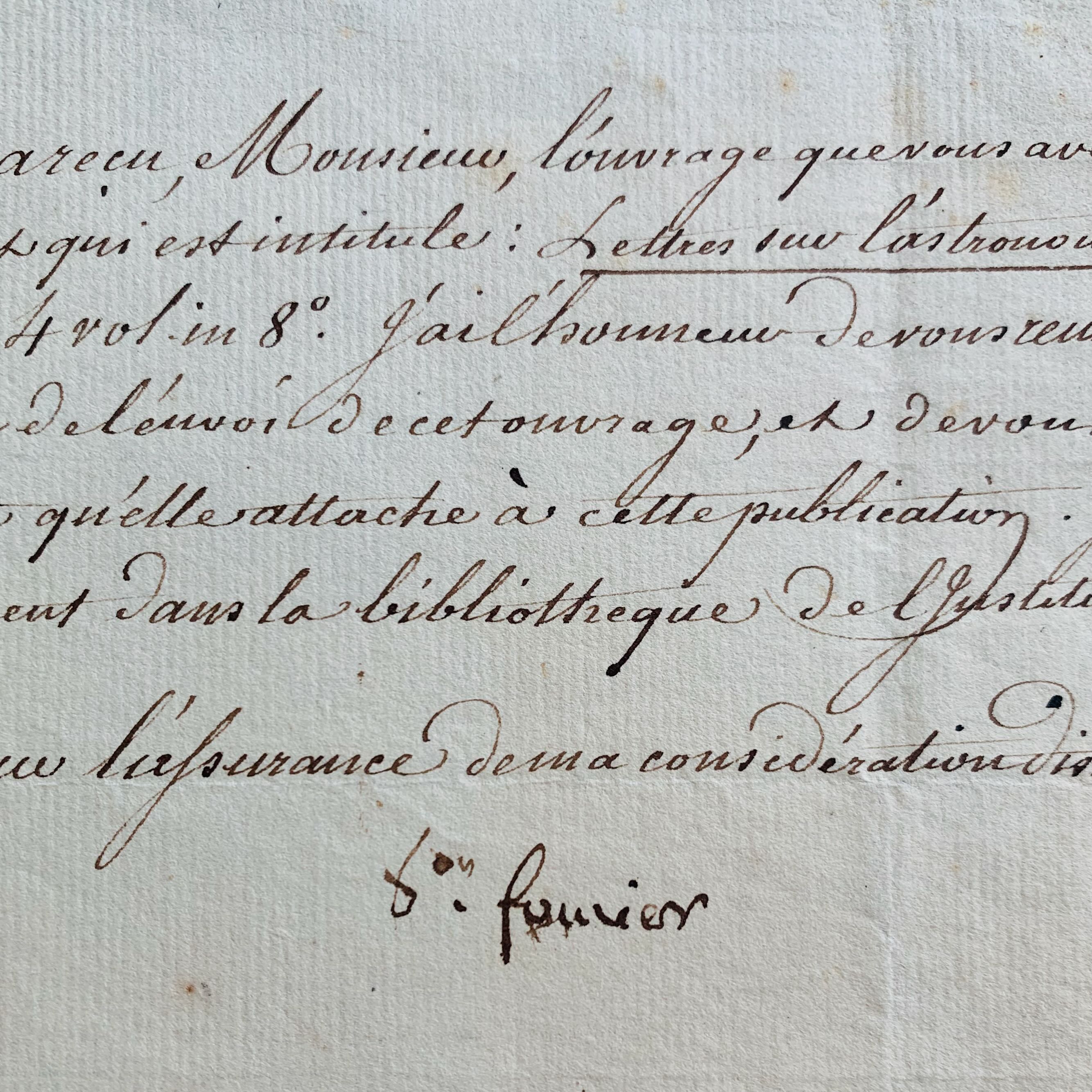 Joseph Fourier accuse réception d’un ouvrage d’astronomie au nom de l’Académie des sciences