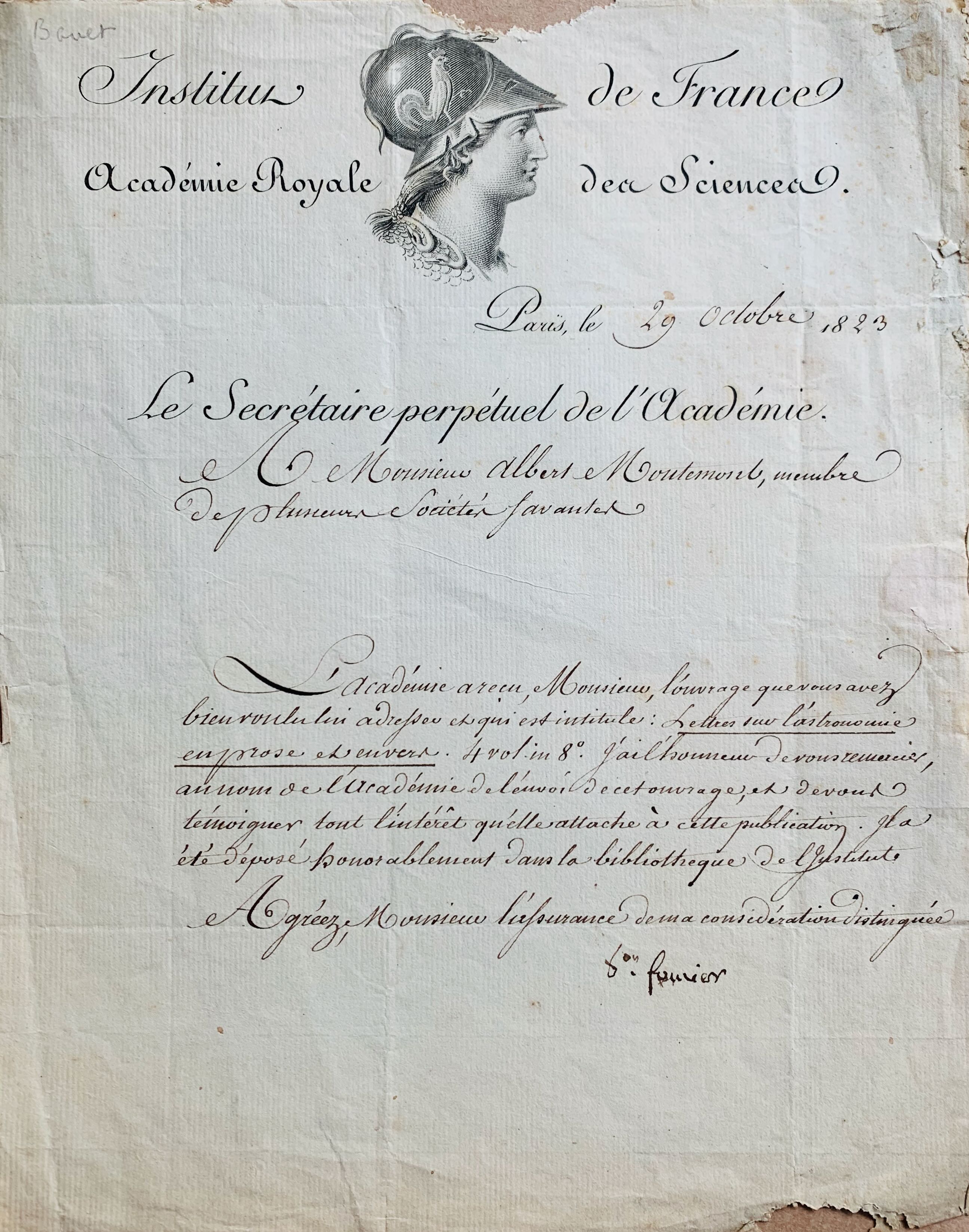 Au nom de l'Académie des sciences, dont il est le secrétaire perpétuel, Joseph Fourrier accuse réception de l'ouvrage en 4 volumes que le voyageur Joseph Montémont a fait parvenir, intitulé : Lettres sur l'astronomie en prose et en vers.