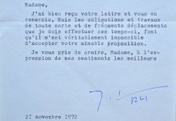 Joseph Kessel se voit contraint de refuser la proposition de sa correspondante. "Les obligations et travaux de toute sorte et de fréquents déplacements que je dois effectuer ces temps-ci, font qu'il m'est véritablement impossible d'accepter votre aimable proposition".