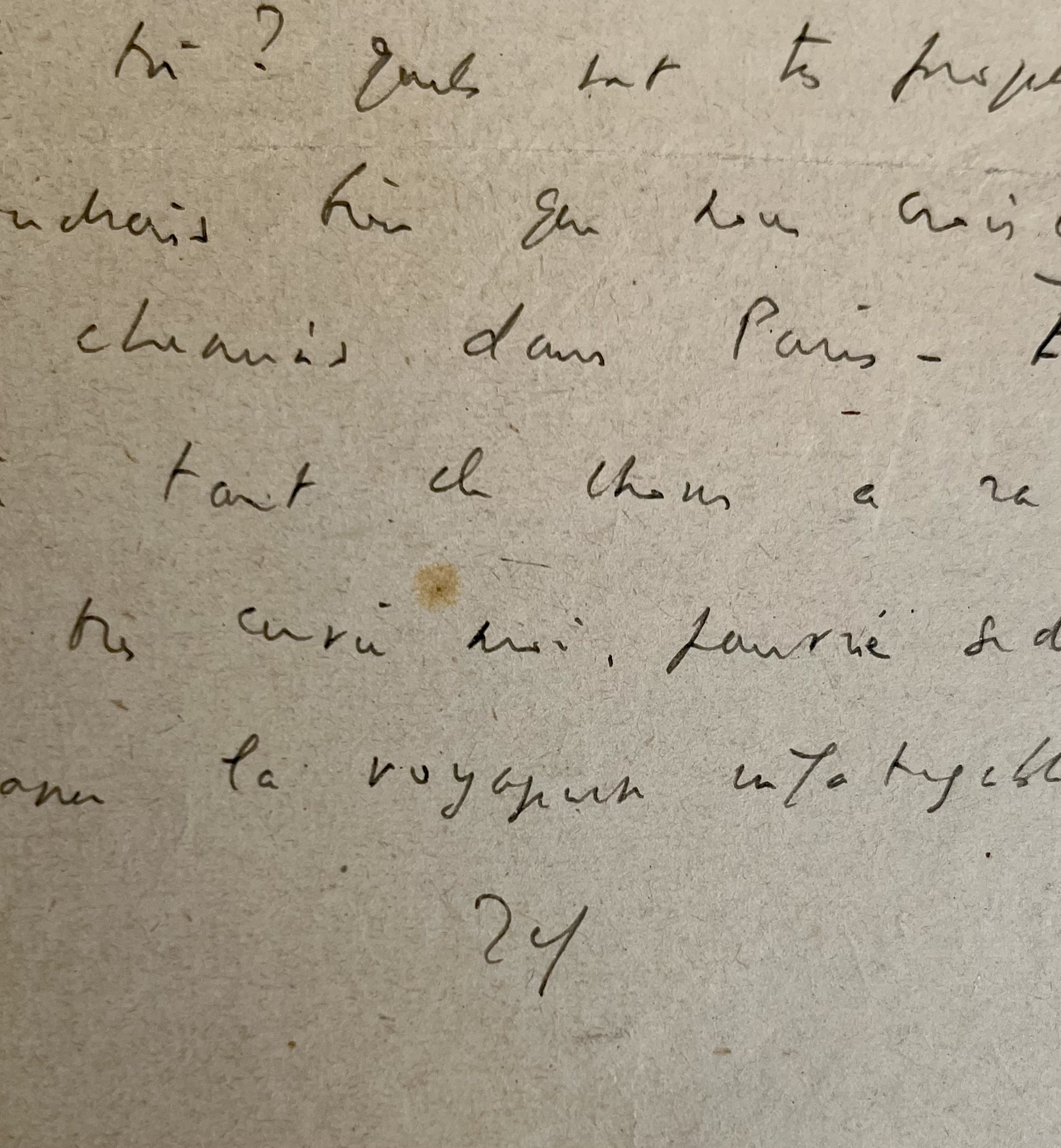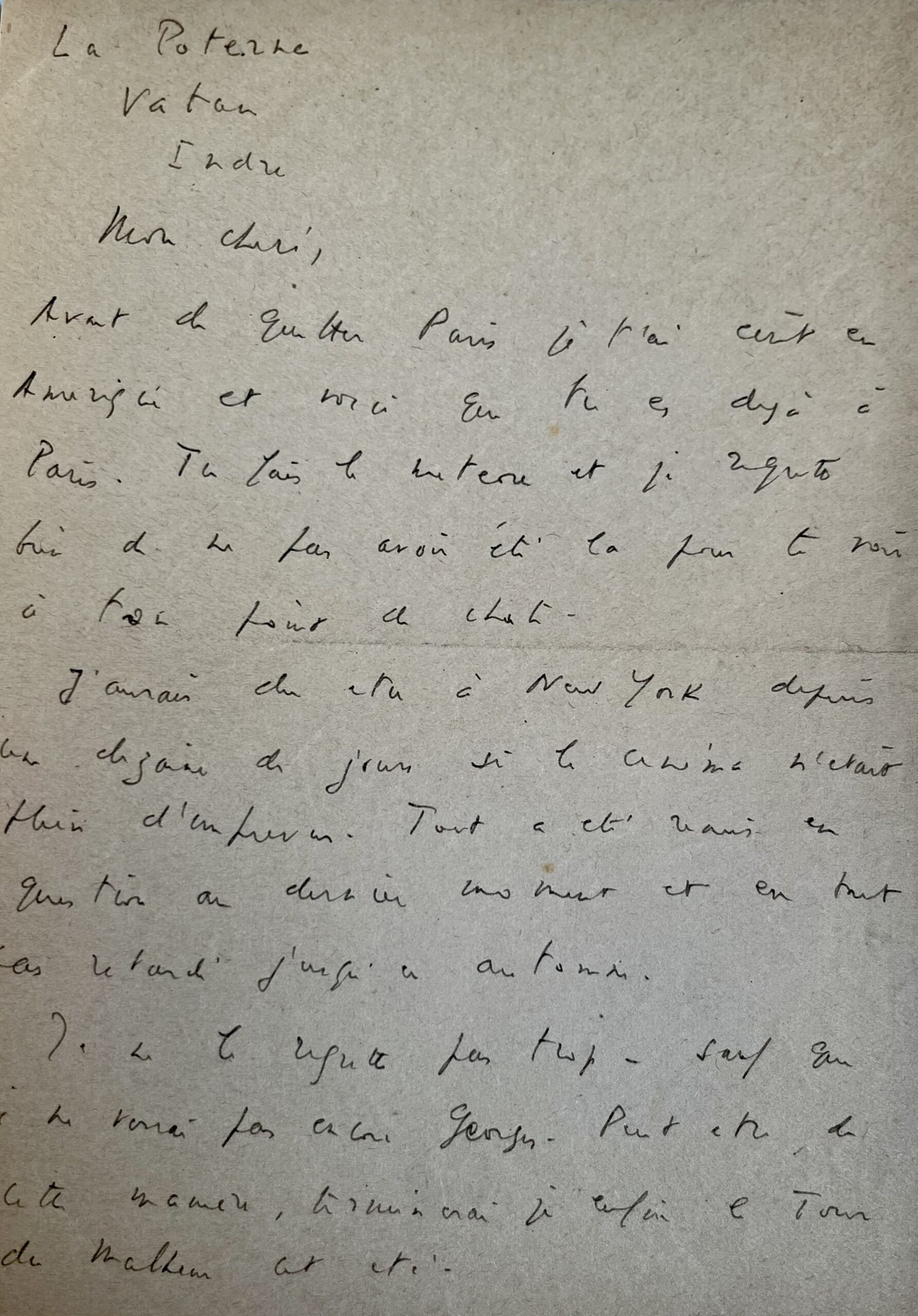 "Avant de quitter Paris je t'ai écrit en Amérique et voici que tu es déjà à Paris. Tu fais le météore et je regrette bien de ne pas avoir été là pour te voir [...].