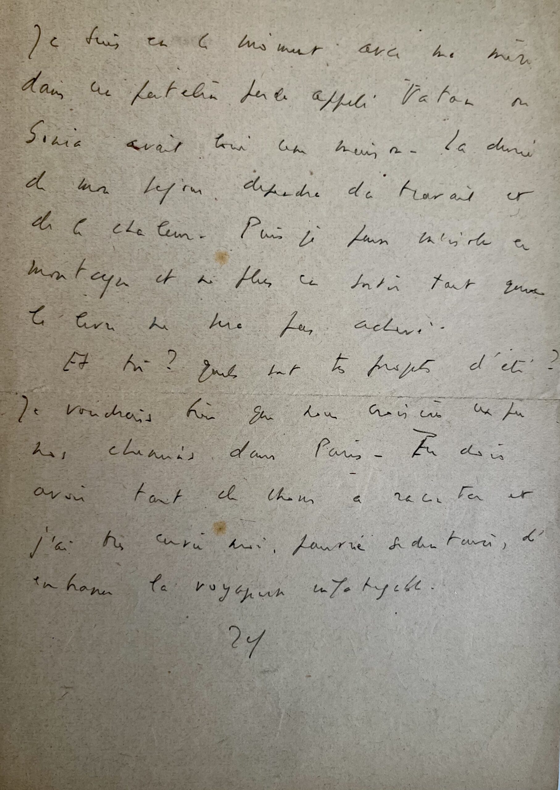 Je suis en ce moment avec ma mère dans un patelin perdu appelé Vatan où Sonia avait loué une maison. La durée de mon séjour dépendra du travail et de la chaleur. Puis je pense m'isoler en montagne et ne plus en sortir tant que le livre ne sera pas achevé. Et toi? Quels sont tes projets d'été? Je voudrais bien que nous croisâmes un peu nos chemins dans Paris. Tu dois avoir tant de choses à raconter et j'ai très envie moi, pauvre sédentaire, d'embrasser la voyageuse infatigable. Jef".