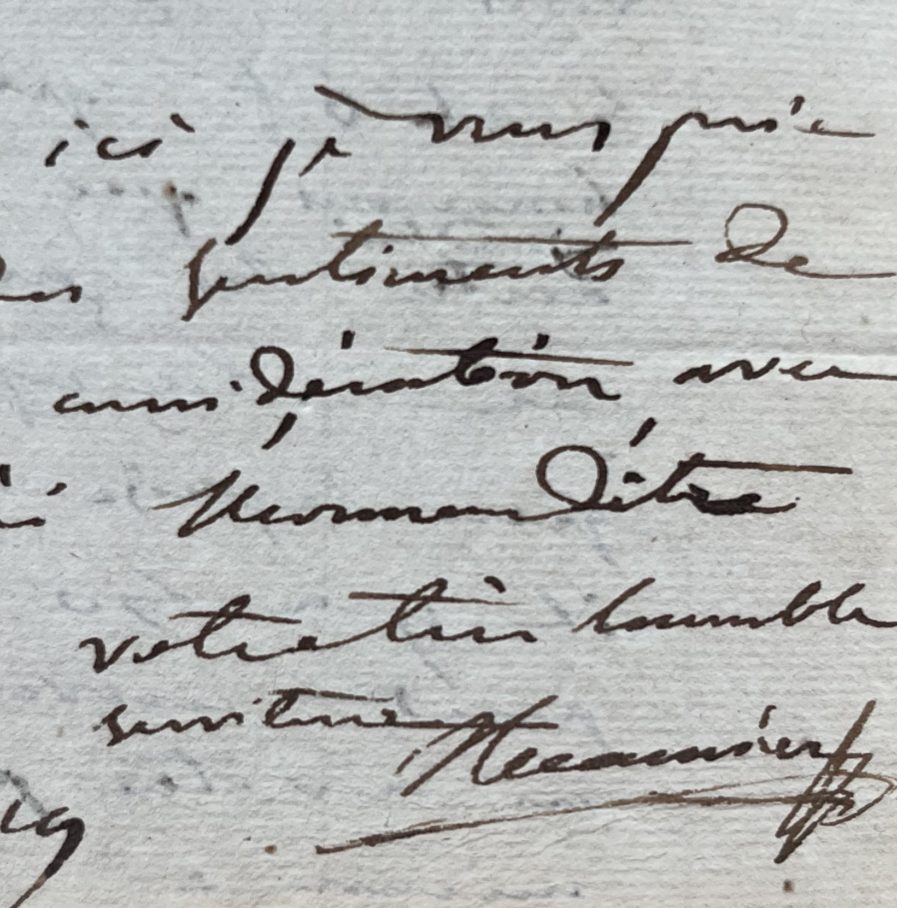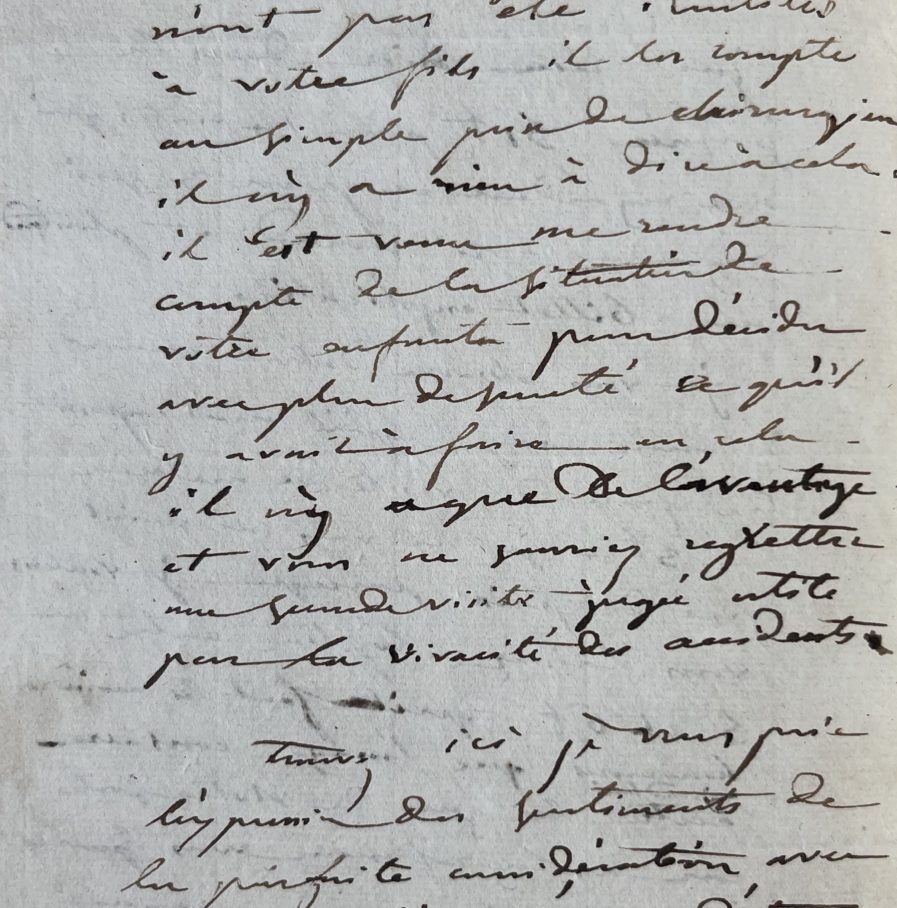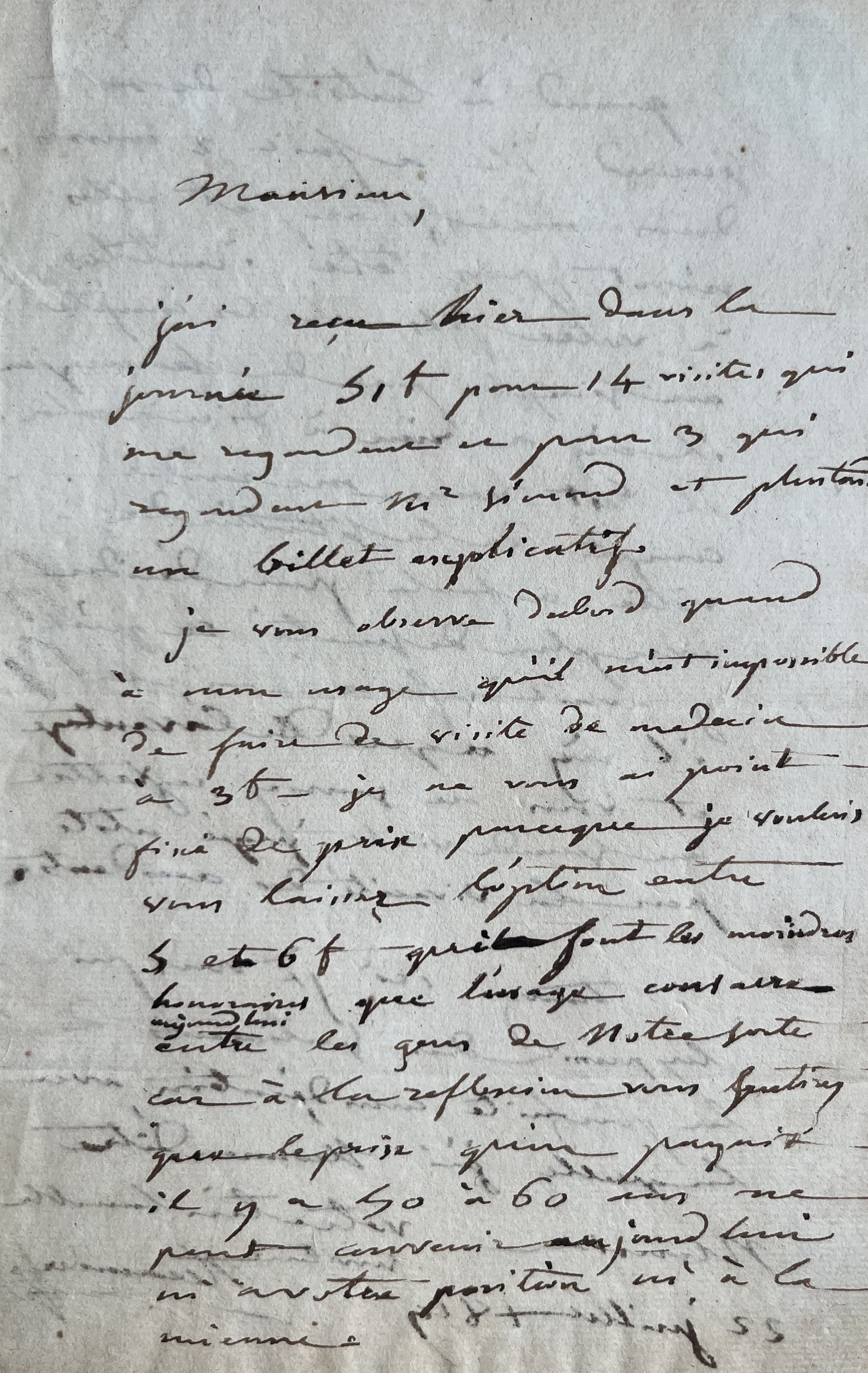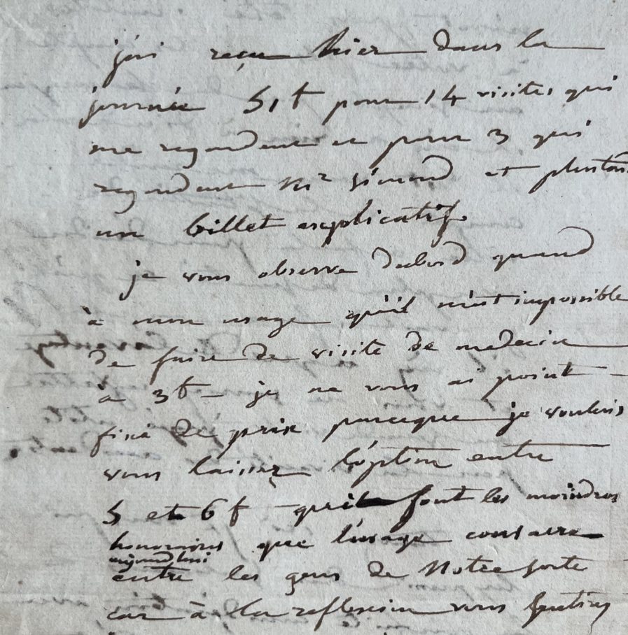 Joseph Récamier (Rochefort, 1774/1852)"J'ai reçu hier dans la journée 51 f pour 14 visites qui me regardent et pour 3 qui regardent Mr Simond et plus tard un billet explicatif. Je vous observe d'abord quand à mon usage qu'il m'est impossible de faire de visite de médecin à 3f. Je ne vous ai point fixé de prix parce que je voulais vous laisser l'option entre 5 et 6 f [...]". Son confrère a, quant à lui, "fait 2 courses dans une soirée et elles n'ont pas été inutiles à votre fils. Il les compte au simple prix de chirurgien. Il n'y a rien à dire à cela. Il est venu me rendre compte de la situation de votre enfant pour décider avec plus de sûreté ce qu'il y avait à faire. En cela il n'y a que de l'avantage et vous ne sauriez regretter une seconde visite, jugée utile par la vivacité des accidents [...]".