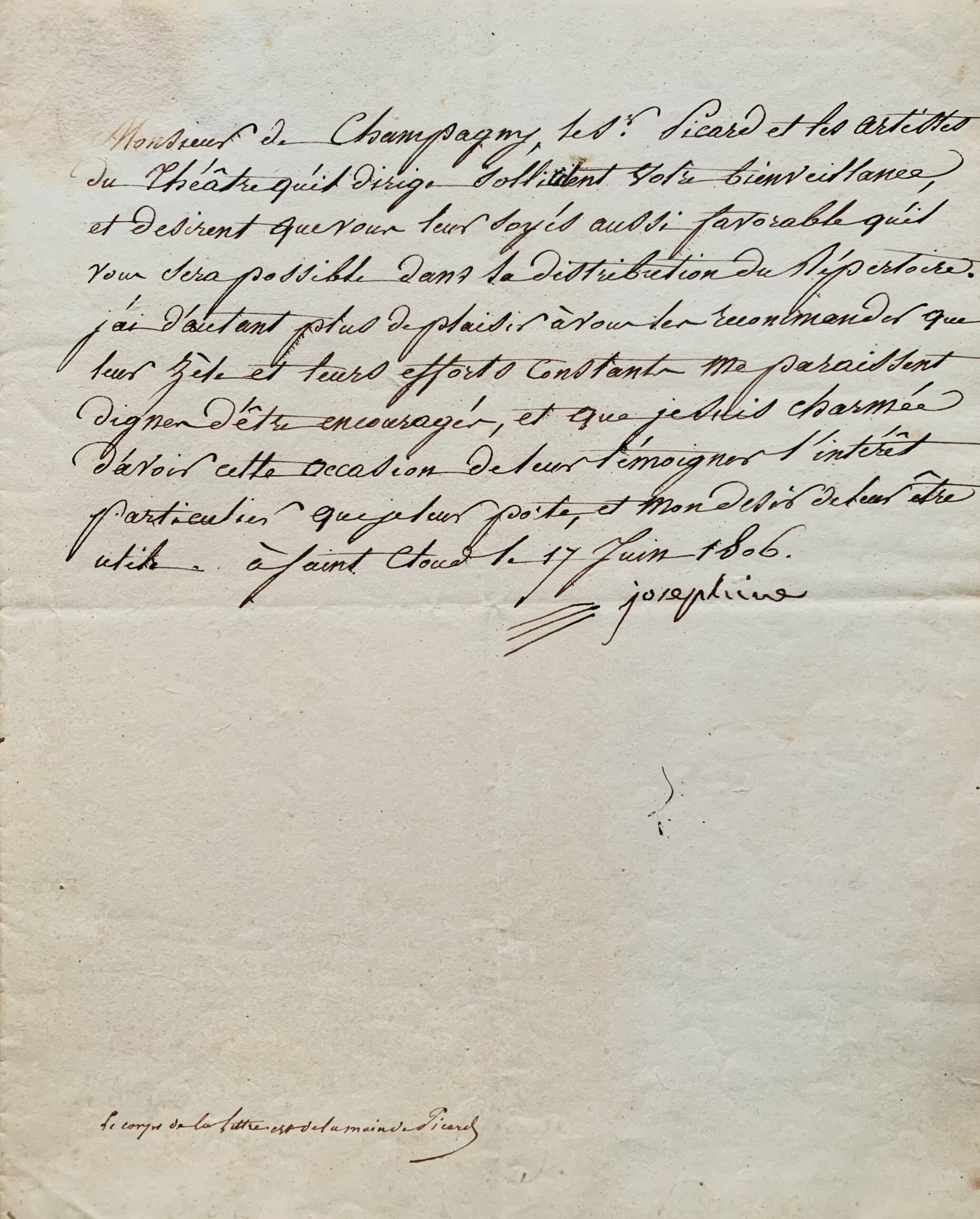 "Le Sr Picard et les artistes qu'il dirige sollicitent votre bienveillance, et désirent que vous leur soyés aussi favorable qu'il vous sera possible dans la distribution du Répertoire. J'ai d'autant plus de plaisir à vous les recommander que leur zèle et leurs efforts constants me paraissent dignes d'être encouragés, et je suis charmée d'avoir cette occasion de leur témoigner l'intérêt particulier que je leur porte, et mon désir de leur être utile".