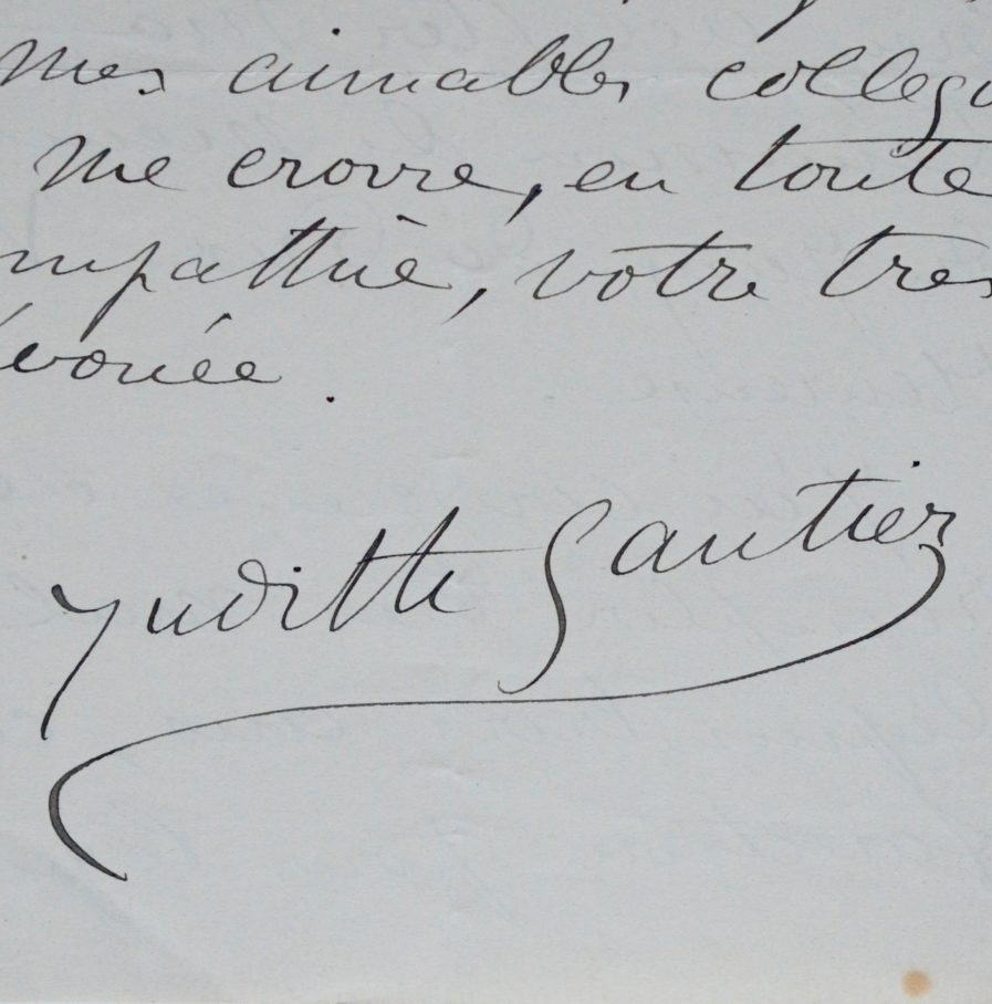 - S.d. Judith Gautier accepte de venir voter pour le prix [Fémina] et présente des excuses "je me suis trompée en m'imaginant que l'année recommençait à la première réunion d'automne [...]". Elle se dit très touchée par une lettre de sa correspondante.