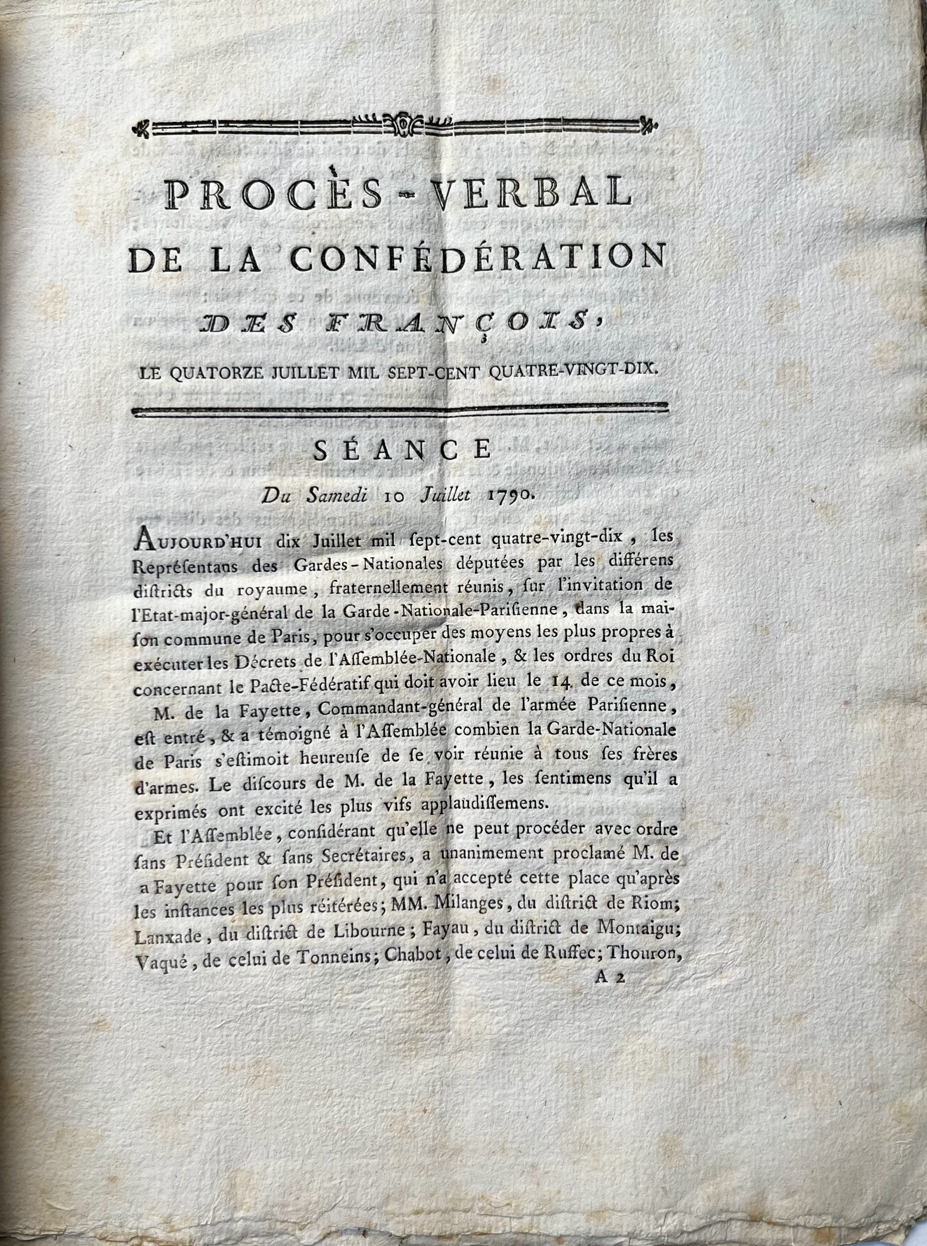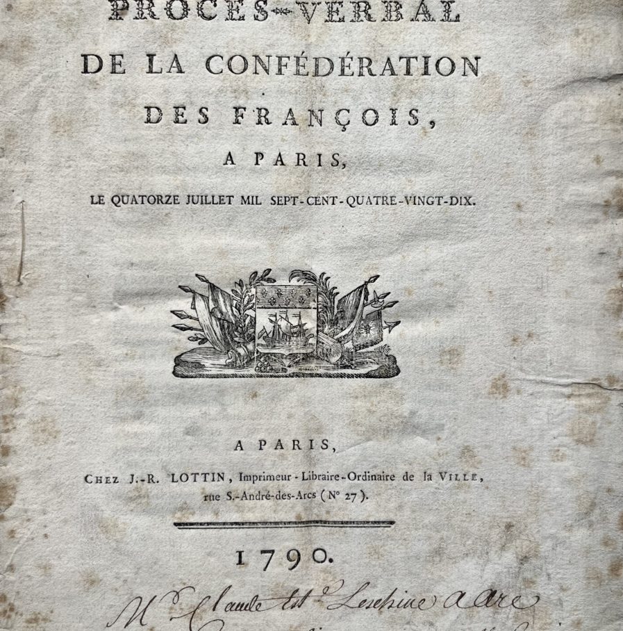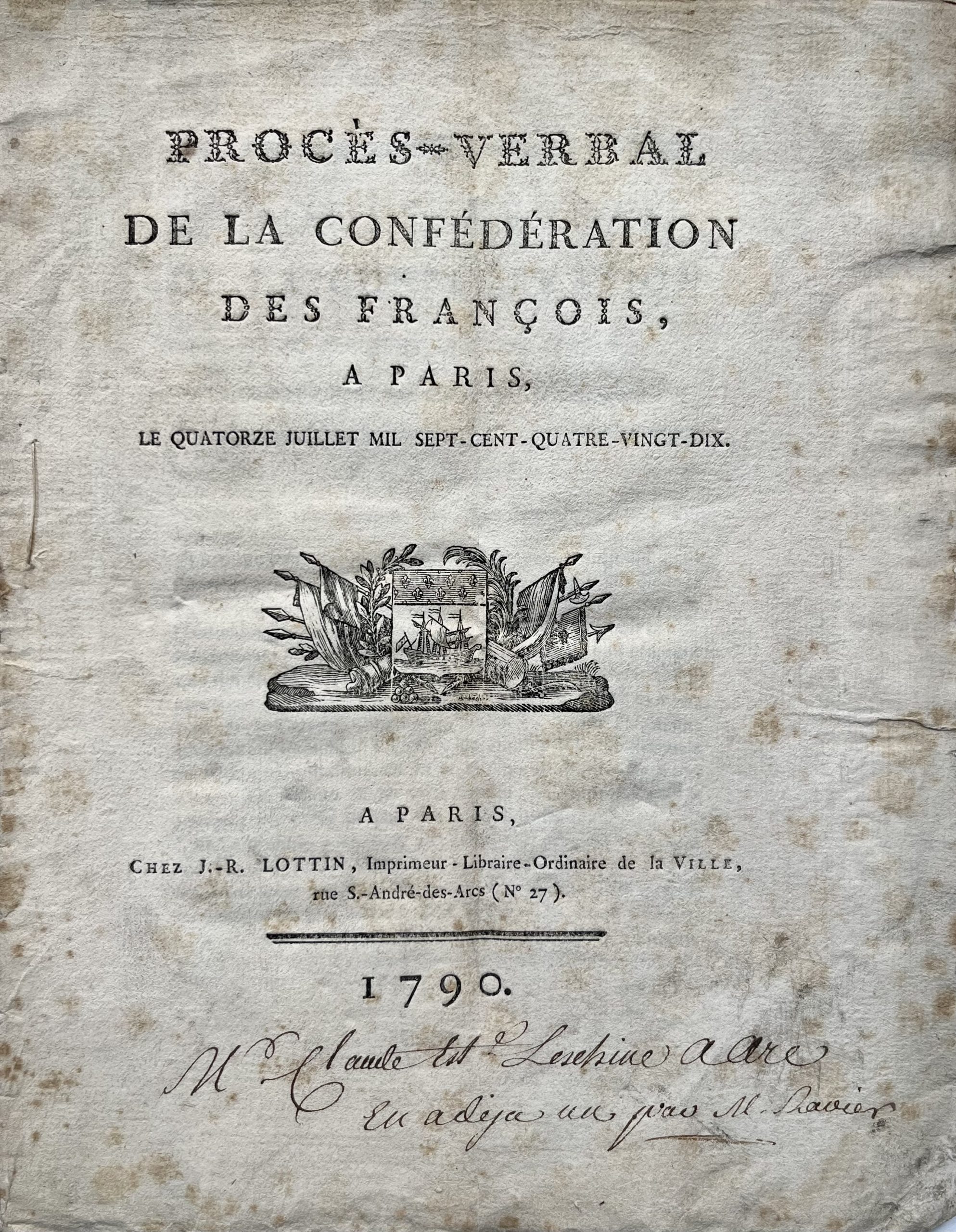 Plaquette brochée intitulée : « Procès-verbal de la Confédération des François à Paris le quatorze juillet mil sept-cent-quatre-vingt-dix », contenant le compte-rendu des séances présidées par Lafayette, du 10 au 24 juillet 1790.