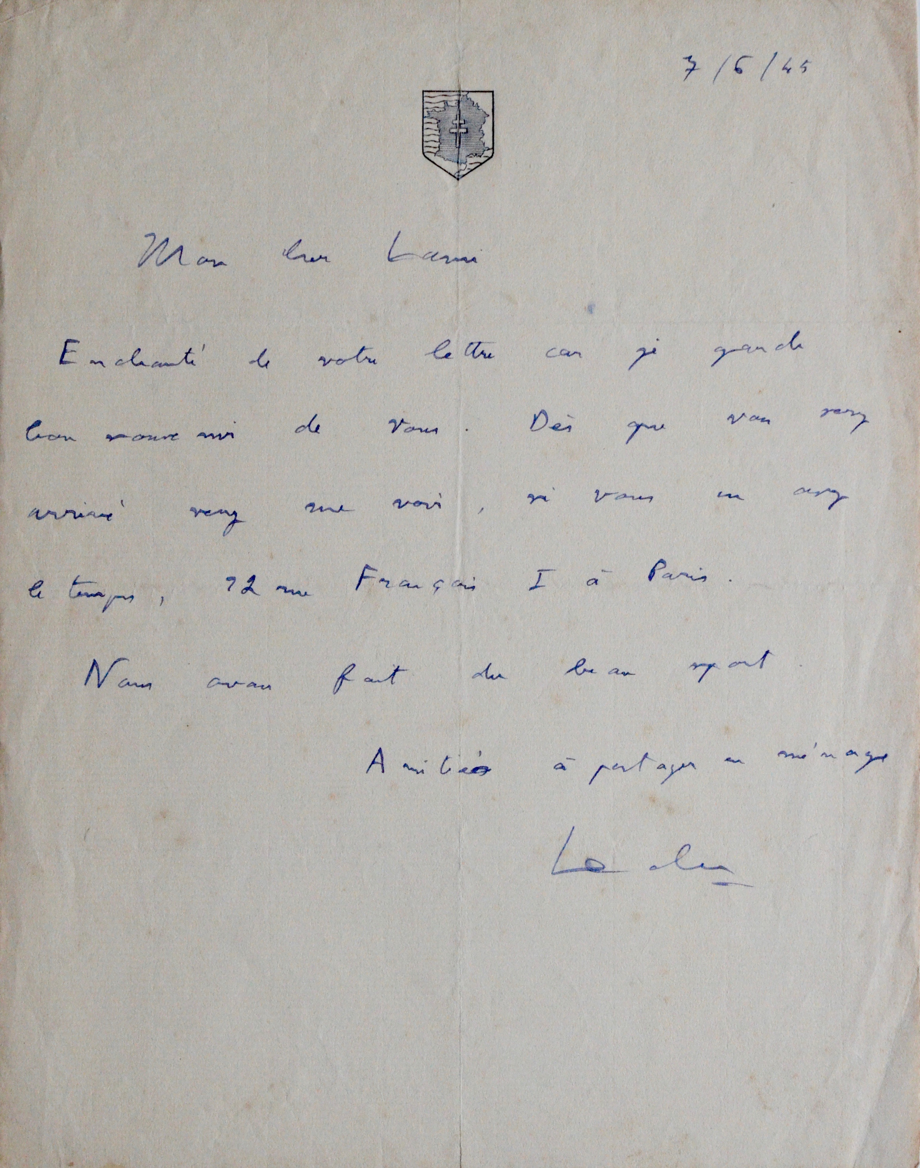 Leclerc se dit "Enchanté de votre lettre car je garde bon souvenir de vous. Dès que vous serez arrivé venez me voir, si vous en avez le temps, 22 rue François 1er à Paris. Nous avons fait du beau sport [...]".