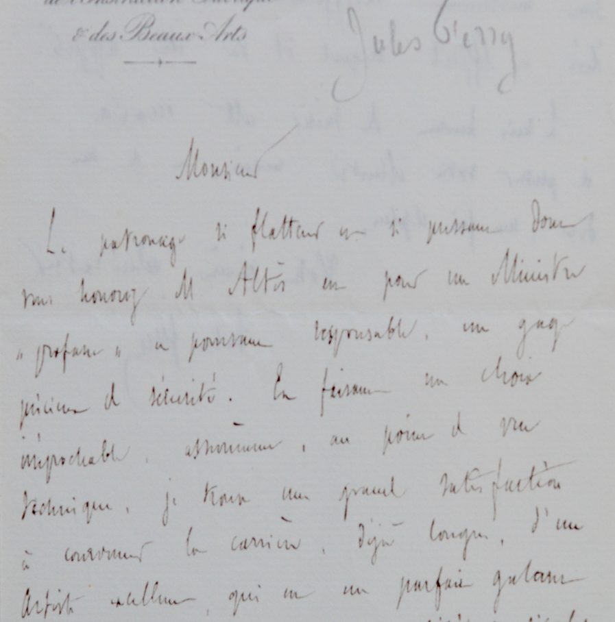 "Le patronage si flatteur et si pressant dont vous honorez M. Altès [le flûtiste et compositeur Joseph-Henri Altès (1826/1895)] est pour un ministre "profane" et pourtant responsable, un gage précieux de sécurité. En faisant un choix irréprochable, assurément, au point de vue technique, je trouve une grande satisfaction à couronner la carrière, déjà longue, d'un artiste excellent, qui est un parfait galant homme, et qui unit aux qualités musicales et aux aptitudes spéciales dont vous êtes si bon juge, ces dons de caractère qui sont nullement indifférents dans le poste élevé et difficile auquel il va être appelé [...]".