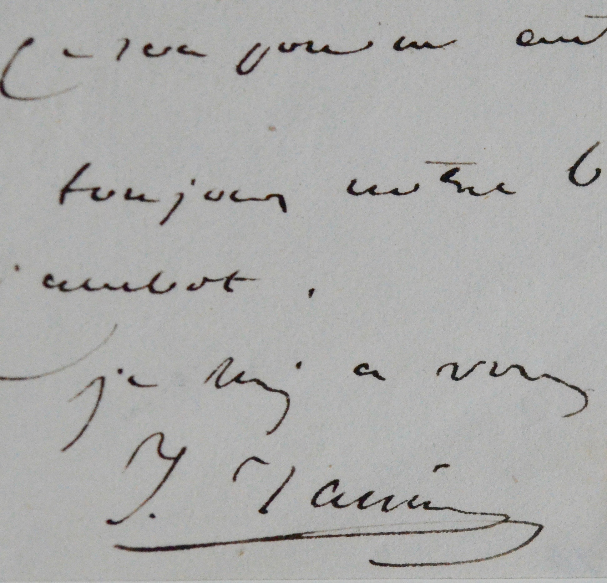 Jules Janin (Saint-Étienne, 1804/1874)Intéressante lettre de Jules Janin, sur la détresse de Gérard de Nerval "[...] Ce pauvre Nerval aurait grand besoin de ce secours. Je l'ai vu avant-hier et il m'a dit tout l'intérêt que vous lui portiez. Nous espérons le faire entrer dans le cabinet du Ministère de l'intérieur [...]. Jamais son esprit n'a été plus présent ni plus vif, vous auriez ainsi là un immense talent tout empli de poésie [...]". Il évoque ensuite le "bon excellent" abbé Cambot.