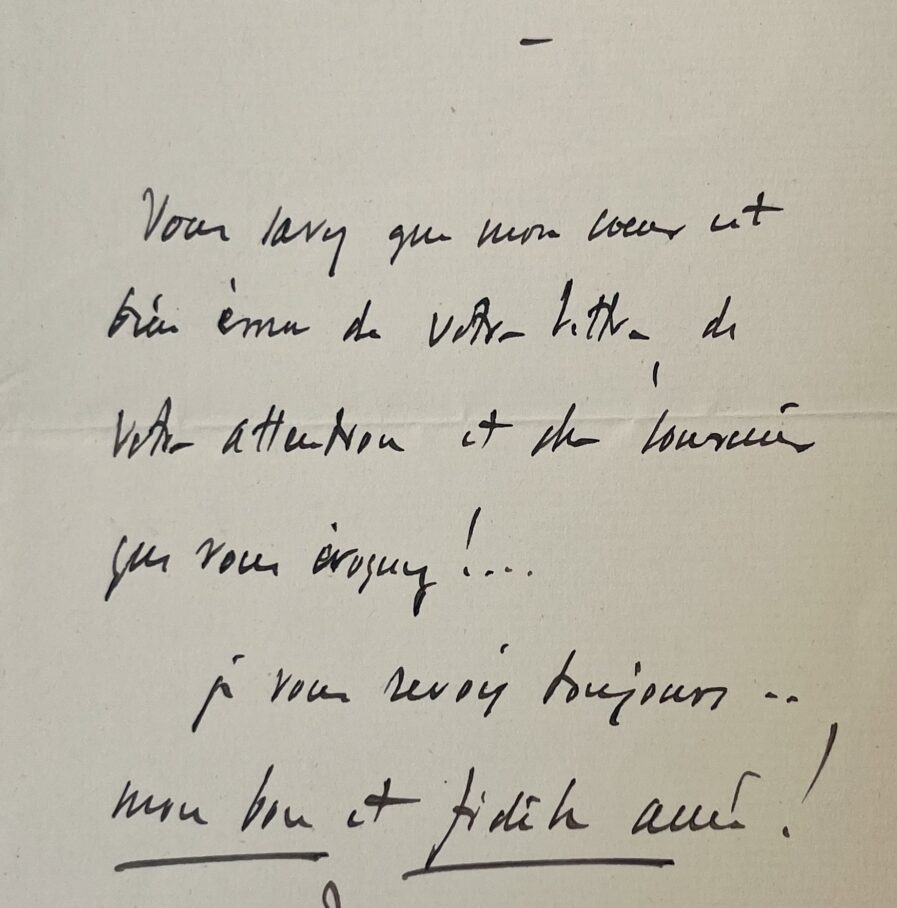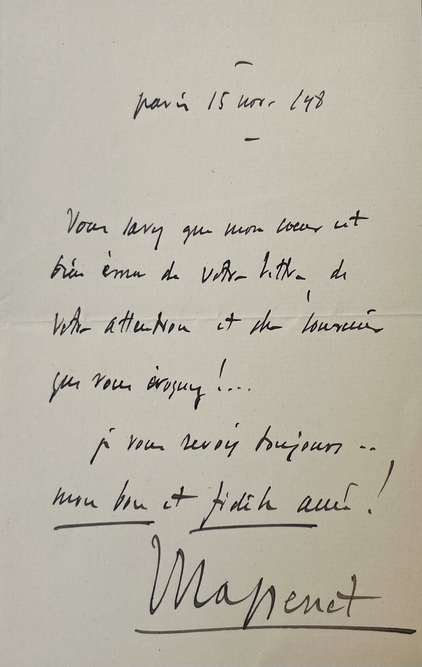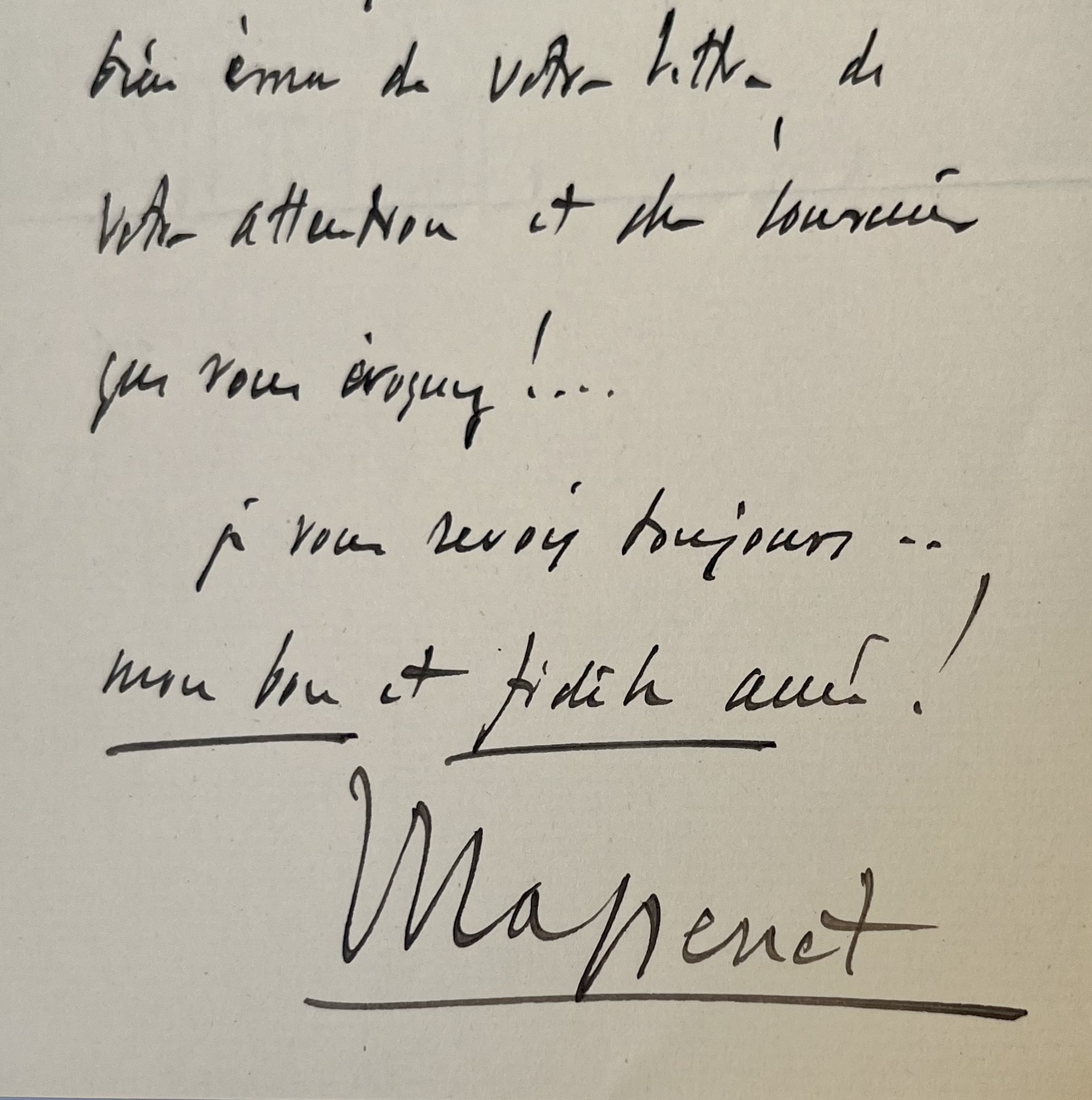 "Vous savez que mon coeur est bien ému de votre lettre, de votre attention et des souvenirs que vous évoquez !... Je vous revois toujours.. mon bon et fidèle ami ! Massenet".