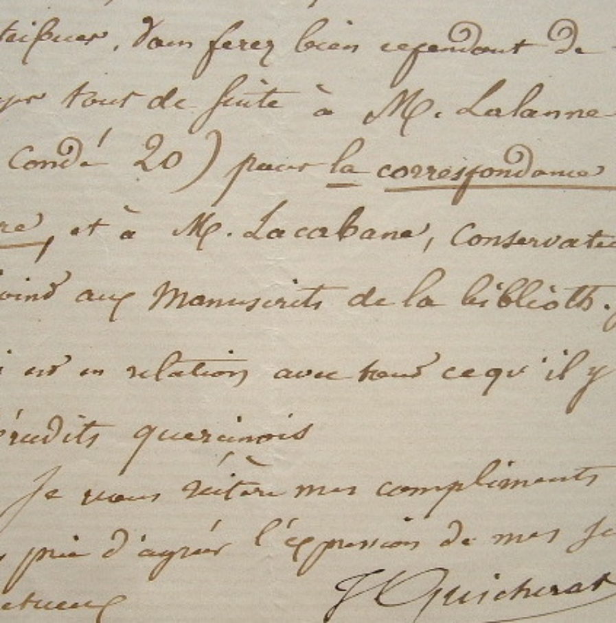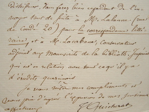 Jules Quicherat (Paris, 1814/1882)Quicherat approuve la thèse de son correspondant, sauf sur un point : Hirtius n'aurait pas été témoin de la dernière guerre des Gaules. «Cela est peu vraisemblable. Du moment que, parlant de trois guerres, il dit qu'il n'a pas assisté à deux d'entre elles, et n'en dit pas autant de la 3me, c'est qu'il a assisté à celle-ci. Il me semble que la réserve que vous faites ensuite devait vous suffir : à savoir qu'il a pu faire la guerre des Gaules sans être à Uxellodunum. Maintenant, je vous dirai que mon sentiment à moi, c'est qu'il y était ; et les inexactitudes de sa topographie ne m'étonnent pas du tout. Dans les états-major de l'antiquité, on ne s'amusait pas à dresser la carte des lieux où l'on opérait ; leur physionomie n'était rendue qu'à grands traits dans les récits que l'on faisait plus tard. Rappelez-vous ce que laisse à désirer la description d'Alesia. Si le général en chef qui avait dirigé les opérations et fait l'étude attentive du terrain s'en tirait avec ce sans façon, que doit-on attendre d'un officier secondaire qui peut-être n'a jamais quité le poste où on l'a mis dès le premier jour ? Hirtius savait que les reconnaissances avaient constaté une ceinture d'eau autour de la montagne ; il l'a dit, en attribuant à une seule rivière ce qui était le fait de deux : il s'est trompé, voilà tout, et les ergoteurs n'ont plus rien à dire du moment que son erreur est démontrée par des témoignages aussi positifs que ceux que vous avez recueillis [...]». Il lui conseille de ne pas mettre son mémoire en circulation pour le moment. [Quicherat a publié, de 1857 à 1865, toute une série d'étude sur Alesia et sa localisation, dont L'Alésia de César rendue à la Franche-Comté].