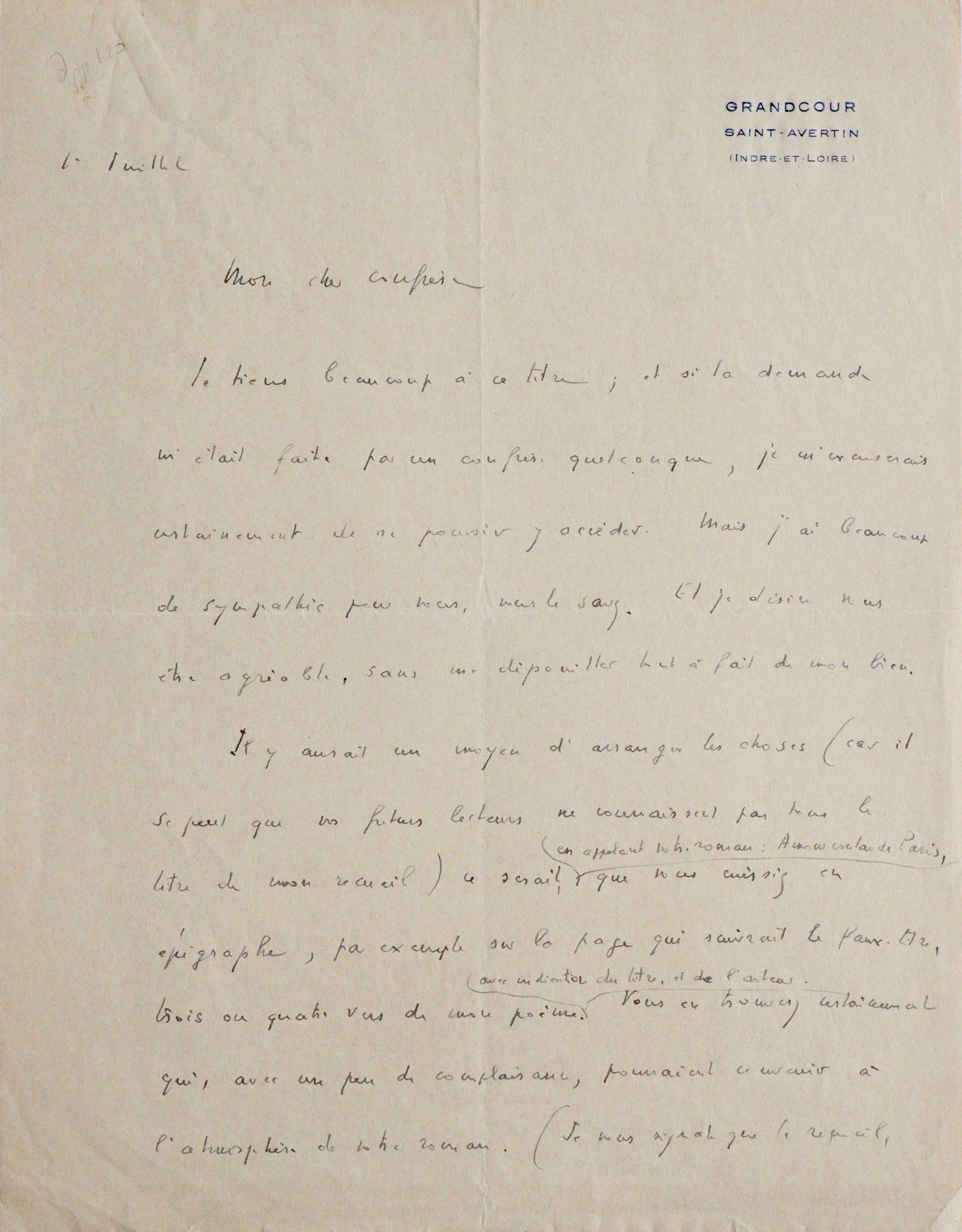 "Mon cher confrère. Je tiens beaucoup à ce titre ; et si la demande m'était faite par un confrère quelconque, je m'excuserai certainement de ne pouvoir y accéder. Mais j'ai beaucoup de sympathie pour vous, vous le savez. Et je désire vous être agréable, sans me dépouiller tout à fait de mon bien. Il y aurait un moyen d'arranger les choses (car il se peut que vos futurs lecteurs ne connaissent pas tous le titre de mon recueil) ce serait en appelant votre roman : Amour couleur de Paris, que vous écriviez en épigraphe, par exemple sur la page qui suivrait le faux titre, trois ou quatre vers de mon poème avec indication du titre, et de l'auteur. Vous en trouverez certainement qui, avec un peu de complaisance, pourraient convenir à l'atmosphère de votre roman. (Je vous signale que le recueil, épuisé aujourd'hui, a reparu avec les Chants des dix Années). Je ne pense pas que cette revendication puisse vous paraitre excessive [...]".