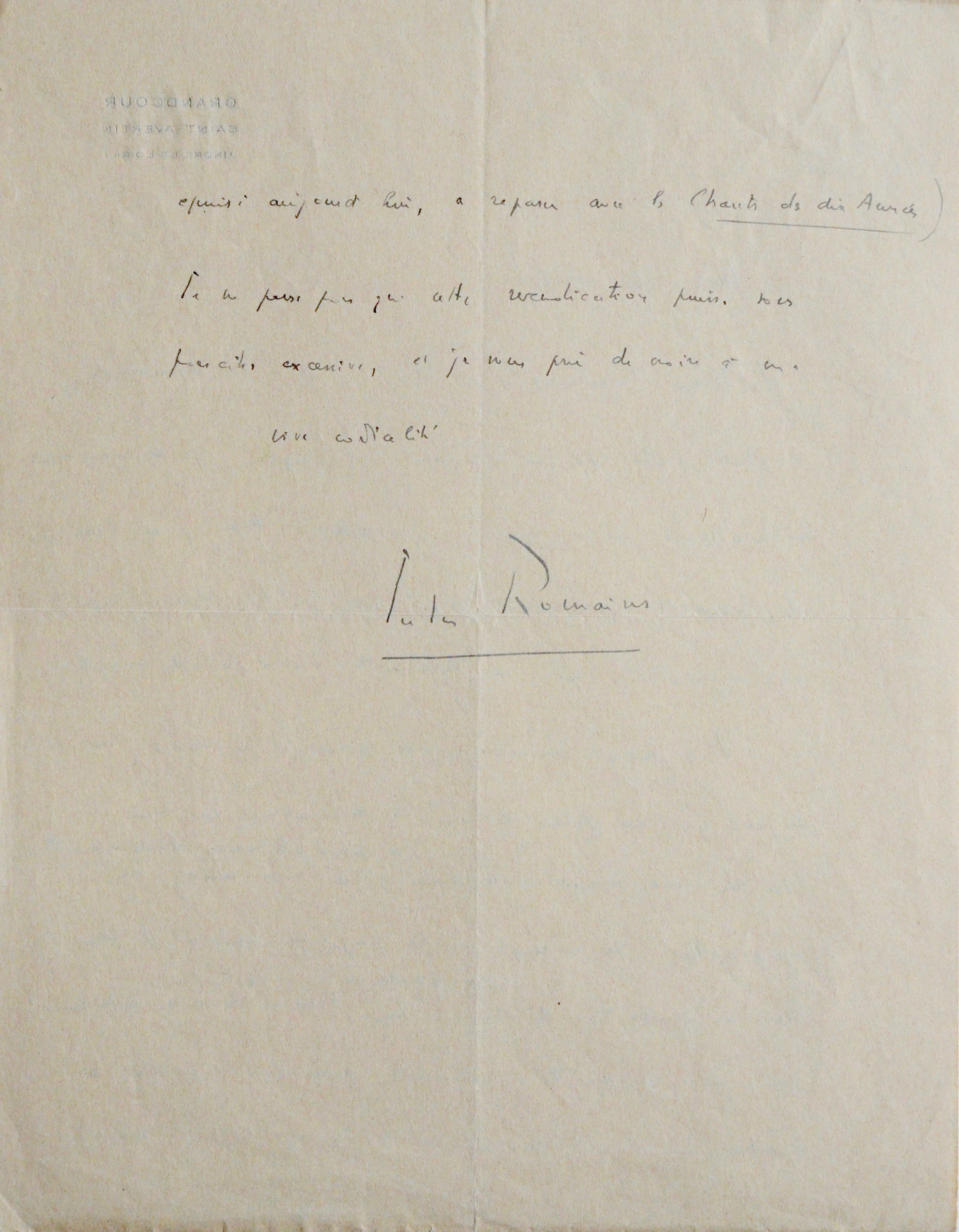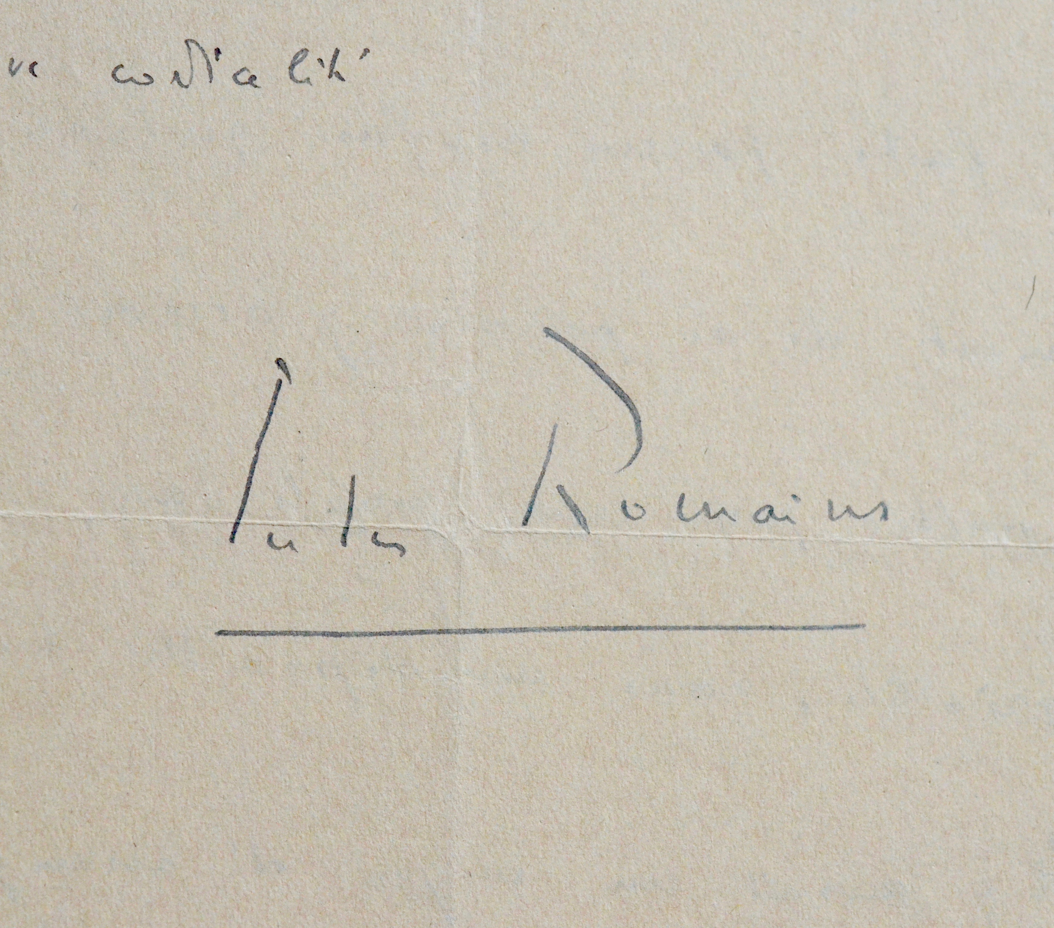 Jules Romains (Saint-Julien-Chapteuil, 1885/1972)Belle et énigmatique lettre de Jules Romains à propos d'Amour couleur de Paris :