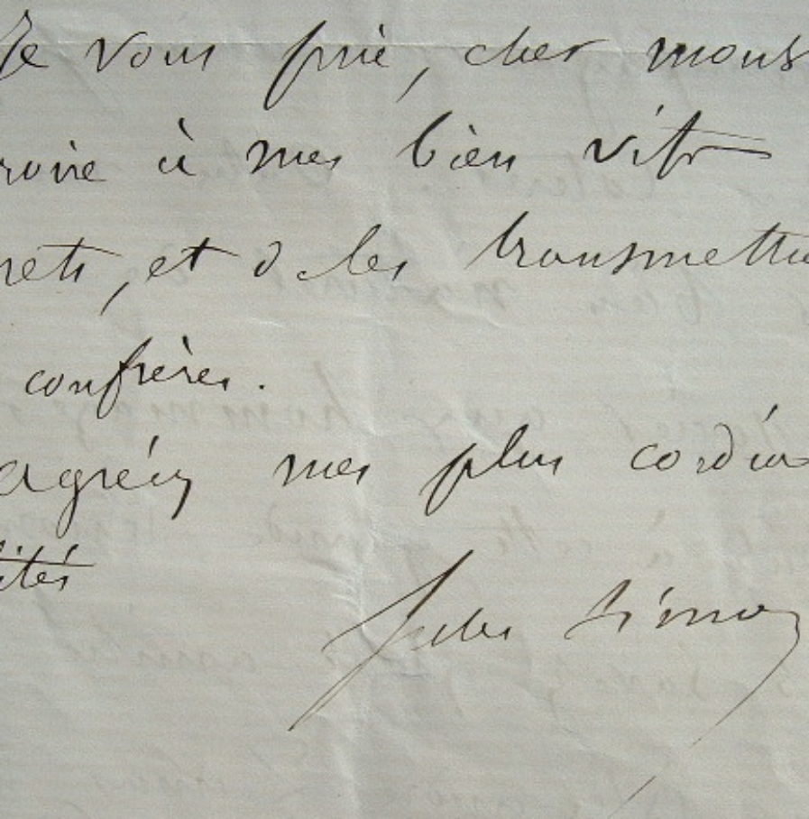 Jules Simon (Lorient, 1814/1896)[Alexandre Dumas décède le 6 décembre 1870, dans sa villa de Puys, près de Dieppe. Suivant son désir, ses restes sont transférés au cimetière de sa ville natale, Villers-Cotterets ; la cérémonie a lieu le 16 avril 1872]. Jules Simon, pris par ses obligations ministérielles ne pourra assister aux obsèques. «J'ai espéré jusqu'au dernier moment qu'il me serait possible de vous accompagner demain jusqu'à Villers Coteret [sic]. Outre mon désir bien naturel de m'associer aux hommages rendus à cette grande renommée, vous savez quelle amitié j'avais pour Alexandre Dumas et de quelle bienveillance il m'honorait. Mais je reçois une convocation pour le conseil des ministres, et il m'est absolument impossible d'y manquer [...]».