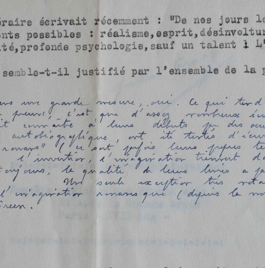 Réponses de Julien Gracq à une enquête d'Edmond Alvy pour la revue Prétexte, sur l'autobiographie et la fiction dans le roman moderne à partir de Gide. A la question sur le manque d'imagination des écrivains contemporains, il répond : «Dans une grande mesure, oui. Ce qui tend pour moi à en faire la preuve, c'est que d'assez nombreux écrivains, après s'être fait connaître à leurs débuts par des oeuvres d'apparence largement autobiographique, ont été tentés d'écrire ensuite de "vrais romans" (ce sont parfois leurs propres termes) : des oeuvres où l'invention, l'imagination tiennent davantage de place. Presque toujours, la qualité de leurs livres a paru s'en ressentir. Une seule exception très notable à cette carence de l'imagination romanesque (depuis la mort de Bernanos), Julien Green». Il dit ne pas comprendre le sens de la question sur l'altération du caractère authentique du roman par la fiction. «Question qui me demeure inintelligible. "Authentique" peut qualifier un testament, une pièce de musée par opposition à un faux ou à une copie. Non, certaines oeuvres littéraires parmi d'autres, à moins qu'il ne s'agisse de les opposer à des pastiches». Il pense que la part d'autobiographie dans son oeuvre est très faible «autant que je peux en juger» et qu'au contraire, celle de la fiction est très grande.