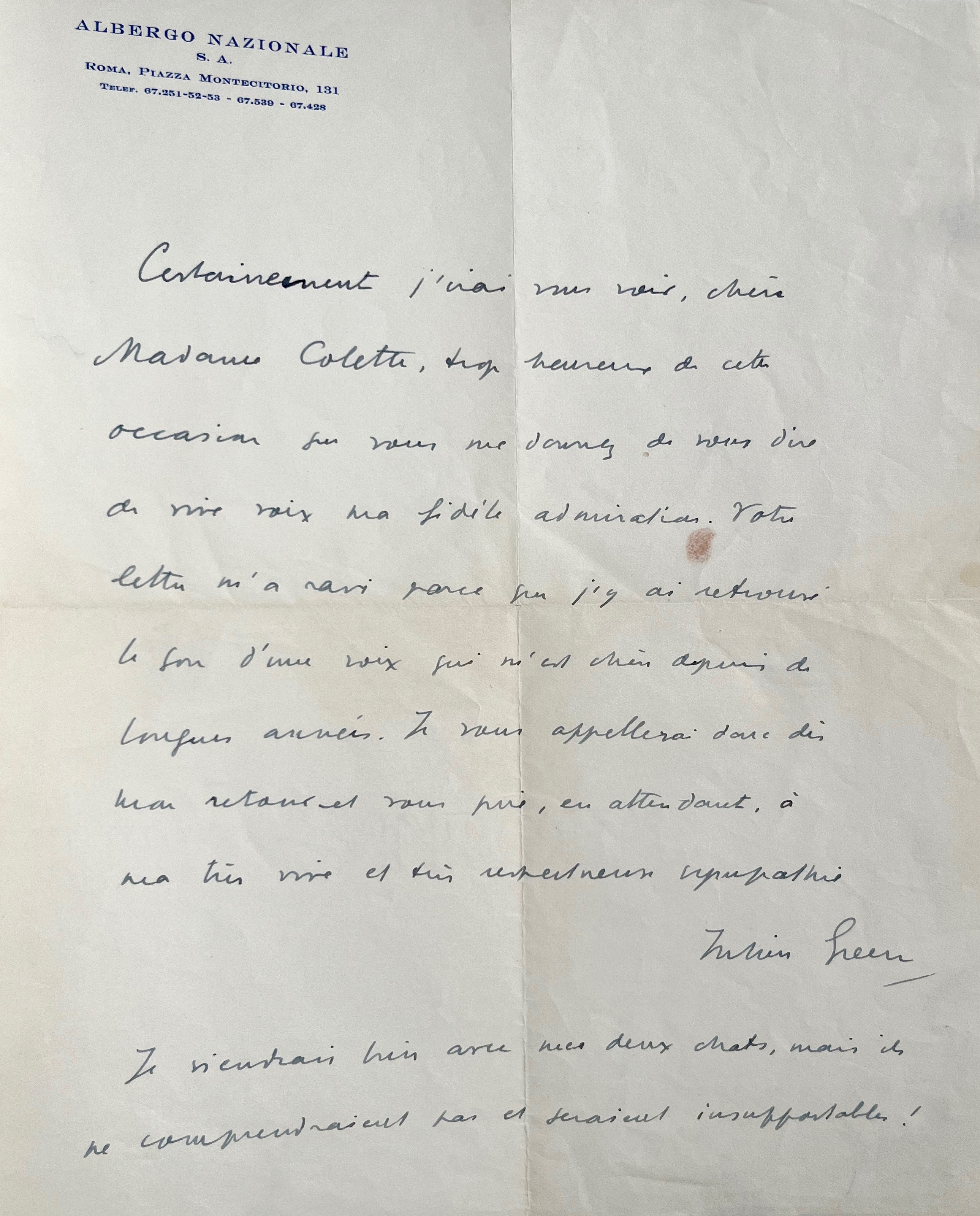 « Certainement j'irai vous voir, chère Madame Colette, trop heureux de cette occasion que vous me donnez de vous dire de vive voix ma fidèle admiration. Votre lettre m'a ravi parce que j'y ai retrouvé le son d'une voix qui m'est chère depuis de longues années [...] ». Il l'appellera dès son retour de Rome pour venir la voir, sans ses deux chats "ils ne comprendraient pas et seraient insupportables !".