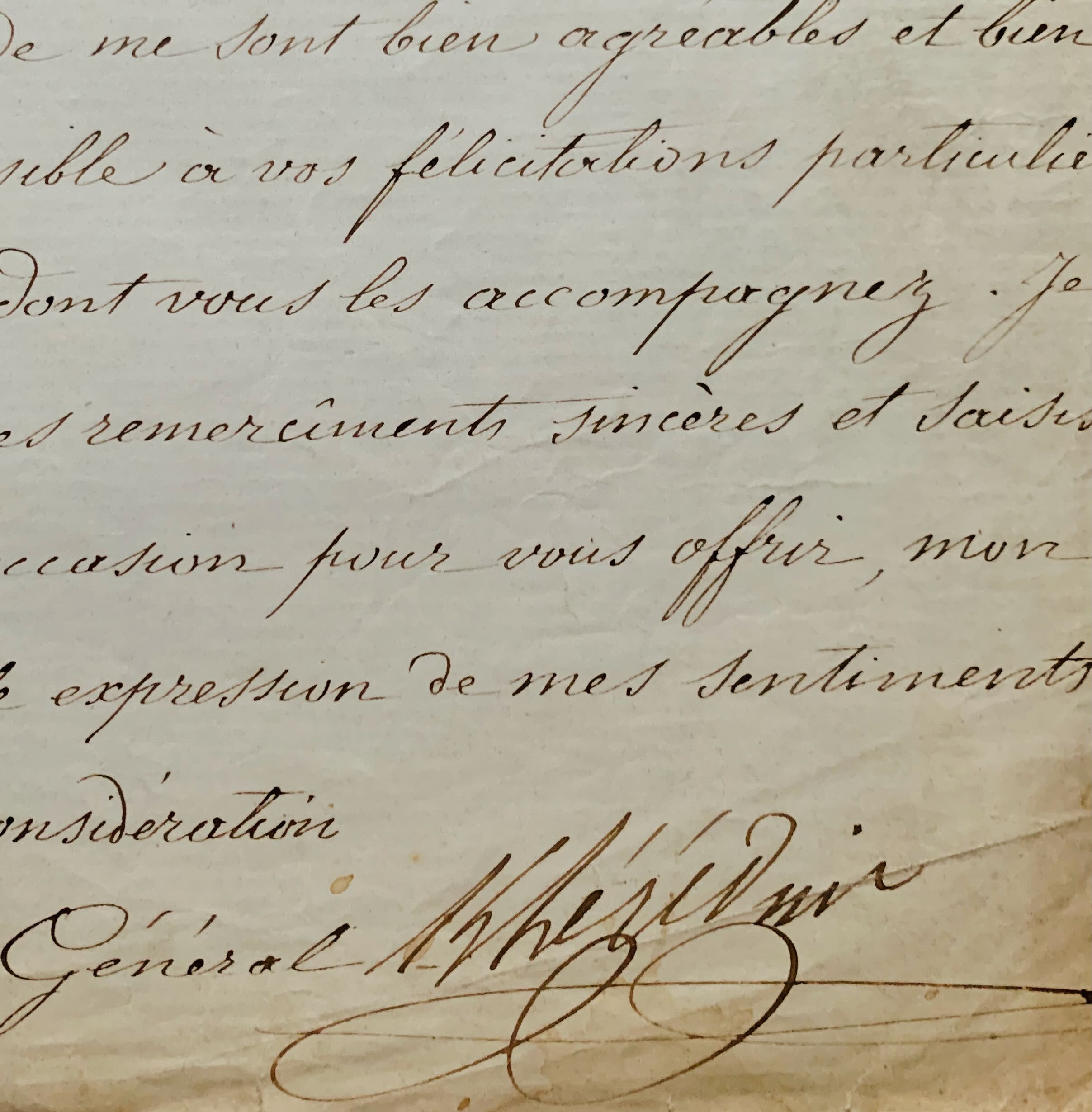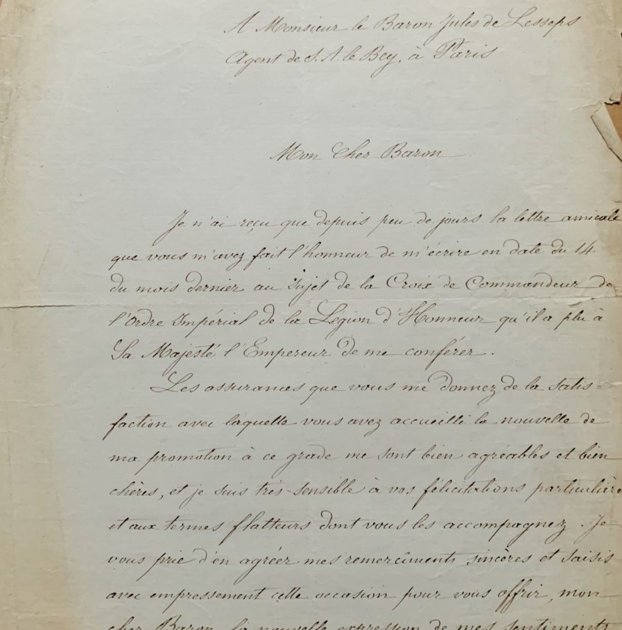"Je n'ai reçu que depuis peu de jours la lettre amicale que vous m'avez fait l'honneur de m'écrire en date du 14 du mois dernier au sujet de la Croix de commandeur de l'Ordre Impérial de la Légion d'Honneur qu'il a plu à Sa Majesté l'Empereur [Napoléon III] de me conférer. Les assurances que vous me donnez de la satisfaction avec laquelle vous avez accueilli la nouvelle de ma promotion à ce grade me sont bien agréables et bien chères [...]".