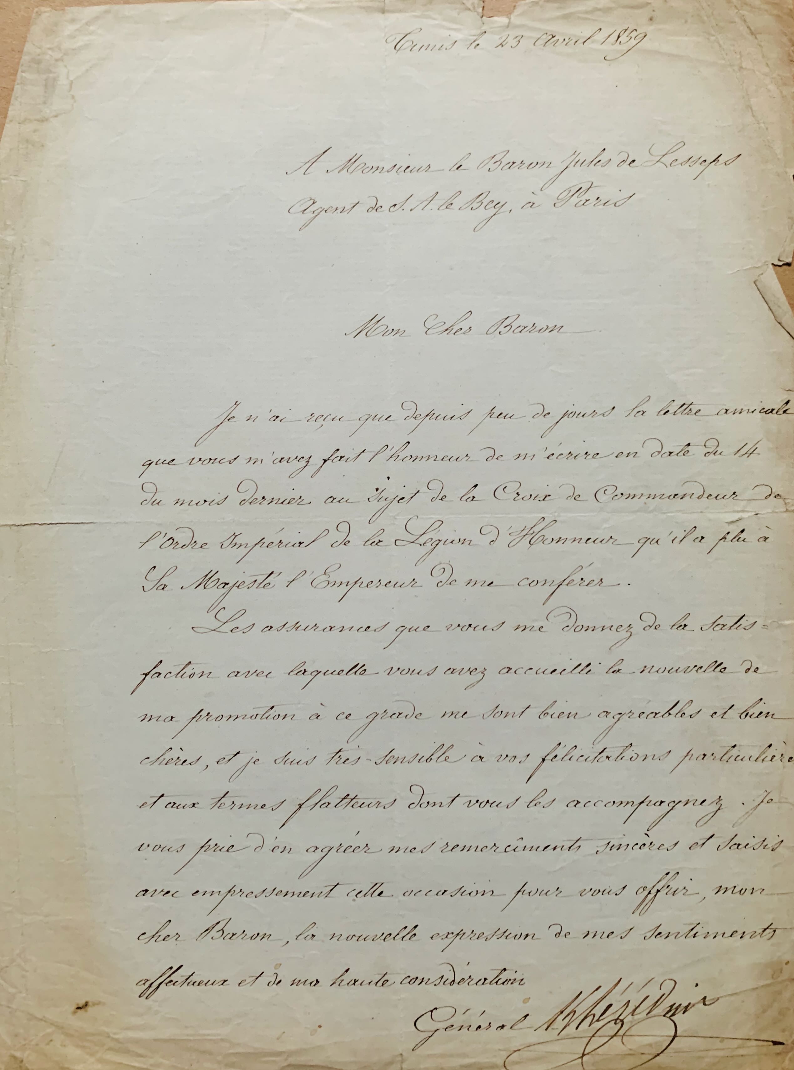 Kheireddine Pacha (1822/1890)Lettre du général Kheireddine, adressée au représentant du bey de Tunis à Paris, le baron Jules de Lesseps, après sa nomination au grade de commandeur de la Légion d'honneur. Elle est signée "Khérédine".
