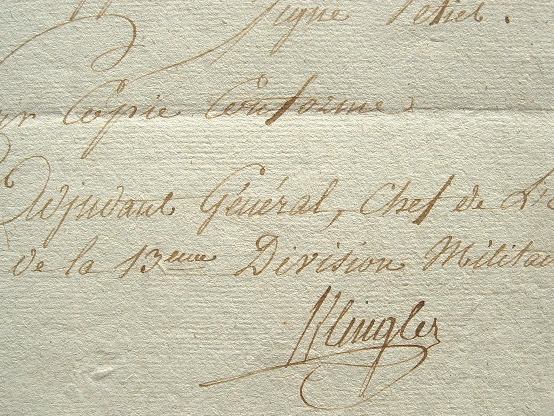 Pièce signée par Klingler, pour copie conforme, d'une lettre du ministre de la Guerre, Petiet, au général Hédouville, commandant les 4 divisions militaires de l'Ouest, à Rennes. Lettre relative à la démission d'un maréchal des logis de la 13e division.