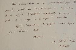 Dans ce billet, Jules Mohl soumet à Jean Baptiste Antoine Guillemin, secrétaire, sa démission de la Société d'Histoire naturelle : «Mes occupations ne me permettent pas de prendre part aux travaux et aux réunions», précise-t-il. [La Société d'Histoire naturelle, née de la Société Linnéenne en 1790, disparaîtra en 1834].