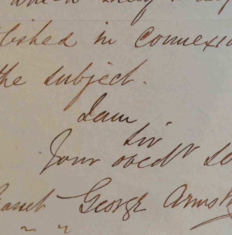 Dans cette lettre en anglais, l'ingénieur des chemins de fer George Armstrong s'emploie à démentir des rumeurs : «The rumours you have observed in the journals of the day are incorrect. The system introduced by him [M. Rouland] was applied universally to Great Britain and Ireland.»