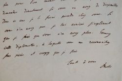 Dans cette lettre aux mille précautions, l'orientaliste Jules Mohl demande, de la part de Prosper de Barante (1782/1866), un exemplaire de sa «petite édition» à l'écrivain Pierre-Simon Ballanche : «Excusez cette diplomatie à laquelle vous me reconnaitrez sans peine.» Il s'agit très probablement du discours prononcé par Barante et Ballanche lui-même pour la réception de ce dernier à l'Académie française, prononcé en 1842 et publié la même année. Mohl aimerait lui rendre visite «mais je n'ai pas une minute à moi, et à peine ma tête», regrette-t-il.