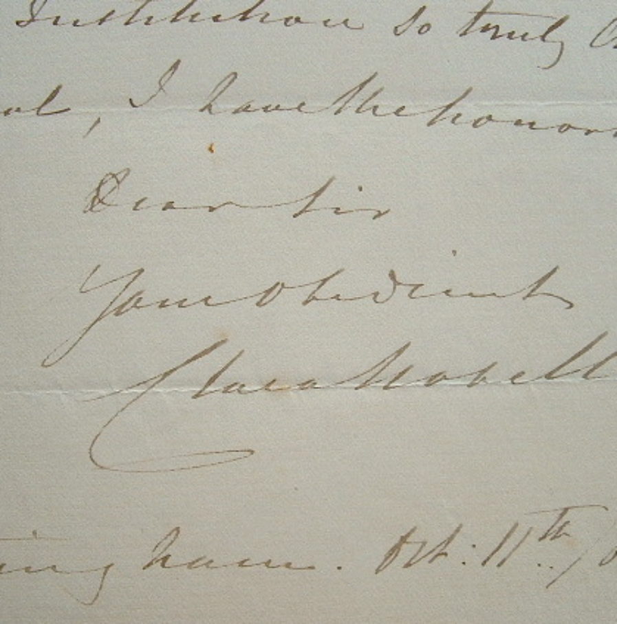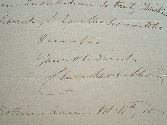 Clara Novello qui, en 1860, fait sa tournée d'adieux, remercie son correspondant pour la visite de son institution et lui promet un concert. «[...] At my request mad[emois]elle Monique had promised to accompaning me, that we might both give a little music [...]». Elle tente de convenir d'un rendez-vous pour mettre ceci au point, étant elle-même très prise par une série de concerts. «Today I sing at Leamington [...]. Tomorrow Derby, saturday Manchester and so on for 7 weeks [...]».