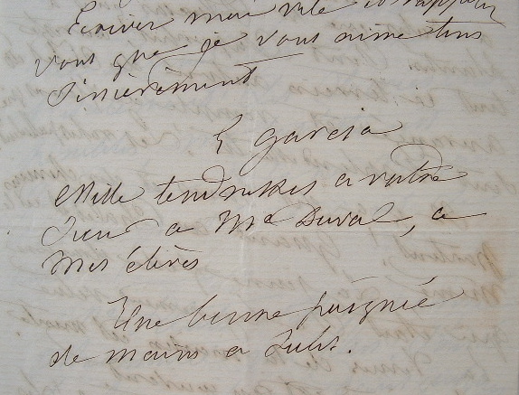 Eugénie Garcia (Paris, 1818/1880)Eugénie Garcia, retirée de la scène, sombre dans la mélancolie. En cure thermale près de Luchon, elle évoque son séjour. «Je n'ai fait que la course du lac de gauche et je joins ici une fleurette que j'y ai cueillie pour vous ! Que dirais-je ? Le souvenir se mêlant au manque de curiosité, j'ai éprouvé faiblement les impressions que vous connaissez ! Puis, la société d'une fille peu élevée et sans intelligence m'ôte le charme du paysage. J'évite tout le monde et, au lieu de ces distractions que je me proposais de me donner, je recherche l'isolement ; les soirées sont pénibles, ma tristesse est profonde : je ne vis que par le passé et il est si noir !». Elle attend Mme Klutz et Marmontel puis ira prendre les eaux de Luchon ; en attendant, elle raconte la vie au chalet, au grand air, au milieu des fleurs.