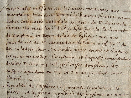 Copie d'époque des conclusions relatives à l'appel d'un jugement sur la possession de la chanoinie de Die, procès entamé par M. de La Baume, chanoine en l'église cathédrale de la ville de Dye et Louis de La Baume Pluvinel, doyen de ladite église, à l'encontre de M. Alexandre Du Pilhon, possesseur de la chanoinie.