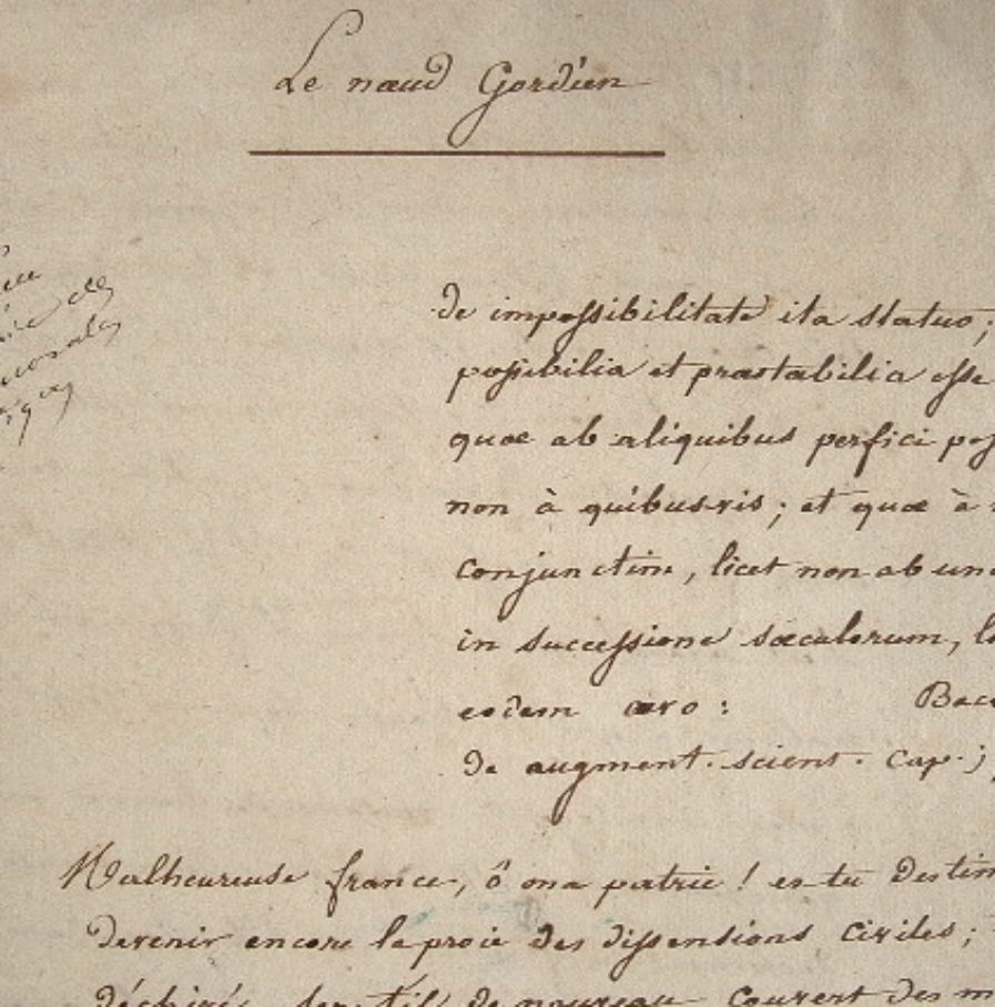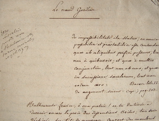 Manuscrit autographe avec quelques corrections d'une main non identifiée, intitulé "Le Noeud Gordien". L'auteur, monarchiste modéré, analyse la charte de 1830, évoque les récents troubles et tente de concilier les intérêts divergents de l'aristocratie et du peuple. Il répond aux différents articles de la Charte en relevant ceux qui ne peuvent être concrètement applicables. Selon lui, le principal fléau vient de la foule de courtisans et de ministres incapables qui occupent les principaux rouages de l'administration du royaume.«Balayons donc ces amas de reptiles souples et insinuants, de caméléons à toutes couleurs, de protées à toutes faces qui ne se nourrissent que de désordres, et plaçons près du trône, un corps pur et sonore qui soit l'écho de la vérité et la fasse retentir sous toutes les voûtes du Palais. Alors le monarque comprendra que les troubles, les dissensions civiles, naissent d'une mauvaise administration, du désordre dans les finances, des vexations, des monopoles exercés par ceux mêmes qui devraient les réprimer ; enfin d'abus de tous genres [...]». Il passe en revue les différentes institutions, justice, impôts, noblesse.