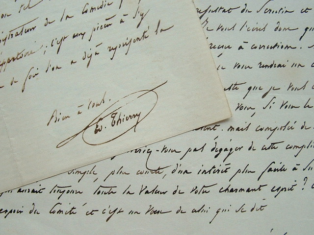 Edouard Thierry (Paris, 1813/1894)Lettres d'Edouard Thierry, administrateur général de la Comédie Française. Dans la première, il lui demande de réécrire la fin de sa comédie et annonce ne pas pouvoir engager l'acteur qu'il convoitait, déjà pris par un rôle important. «On répètera votre comédie ; mais je ne saurais la mettre sur l'affiche que quand elle entrera utilement pour le théâtre dans la composition du répertoire». Par contre, il n'en est pas de même pour son autre pièce, La Queue du Chien d'Alcibiade. «Permettez-moi de vous rappeler qu'elle a eu un tort, celui de manquer le succès à son début. Il n'y a pas, au théâtre de droit personnel, qui soit celui de tel ou tel talent, il y a surtout celui du succès. Ce n'est pas l'administrateur de la Comédie Française qui peut maintenir une pièce au répertoire ; c'est aux pièces à s'y maintenir elles-mêmes [...]». Dans une seconde lettre, il lui annonce que sa dernière pièce a été refusée par le comité et souhaite venir lui en expliquer les raisons. «Vous avez fait une pièce remplie de talent, mais composée de trop de pièces à la fois. Ne pourriez-vous pas dégager une pièce plus simple, plus courte, d'un intérêt plus facile à suivre et qui aurait toujours la valeur de votre charmant esprit ? [...]».
