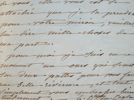 Zoé Talon Cayla (comtesse du) (Paris, 1784/1850)La comtesse du Cayla explique son retard : «Le renvoi de mon régisseur, qui volait outre mesure, m'a causé des embarras et donné beaucoup d'occupation. Je me suis résignée à rétablir le bon ordre, et je vous assure que je m'y suis donnée entièrement, courant les bois, et sur l'eau, le nez dans les chiffres dès que je suis rentrée, recevant tous les habitants. Je suis totalement hors de mes gonds et de mes allures. Le résultat en est très bon et soutient mon courage. J'irai jusqu'au but que je me suis proposé [...]». Elle s'inquiète de Miss Henriette. «Elle vous est si attachée que je la prendrais pour votre miroir [...]. Pour moi, je suis en ce moment un ours qui se met sur deux pattes pour vous faire une belle révérence, et tout simplement vous embrasse bien tendrement».