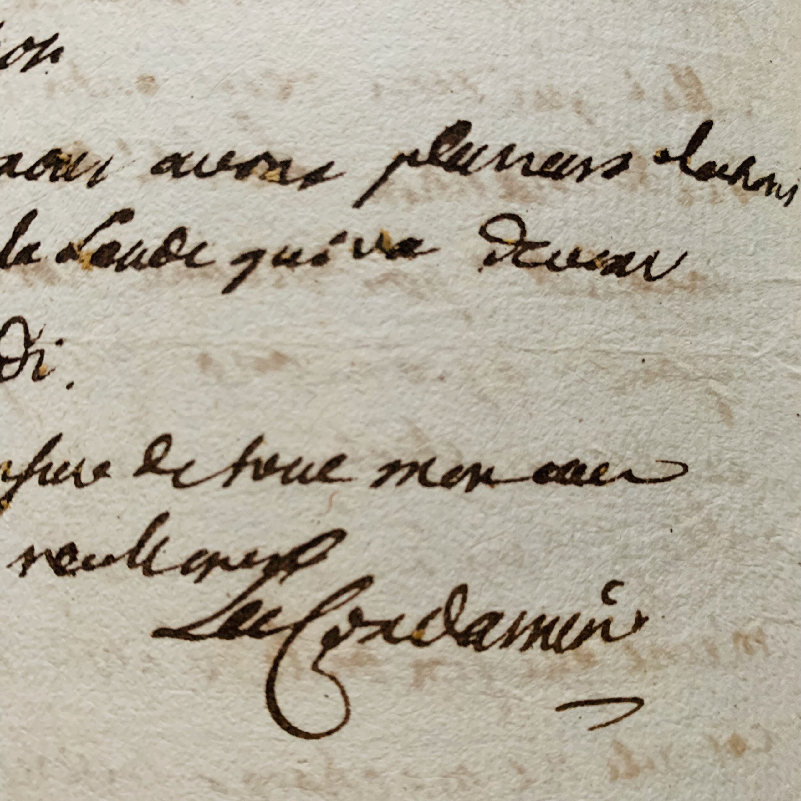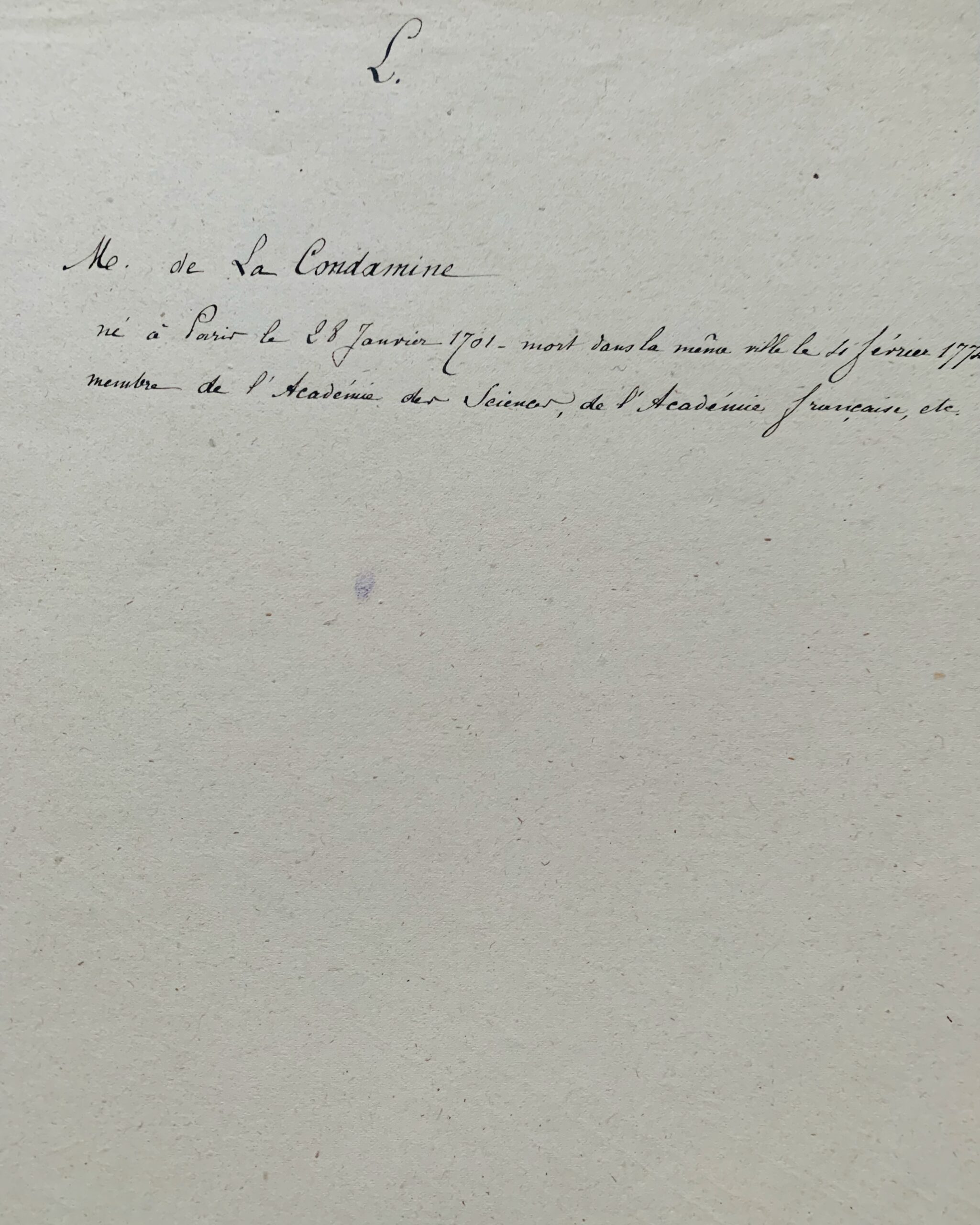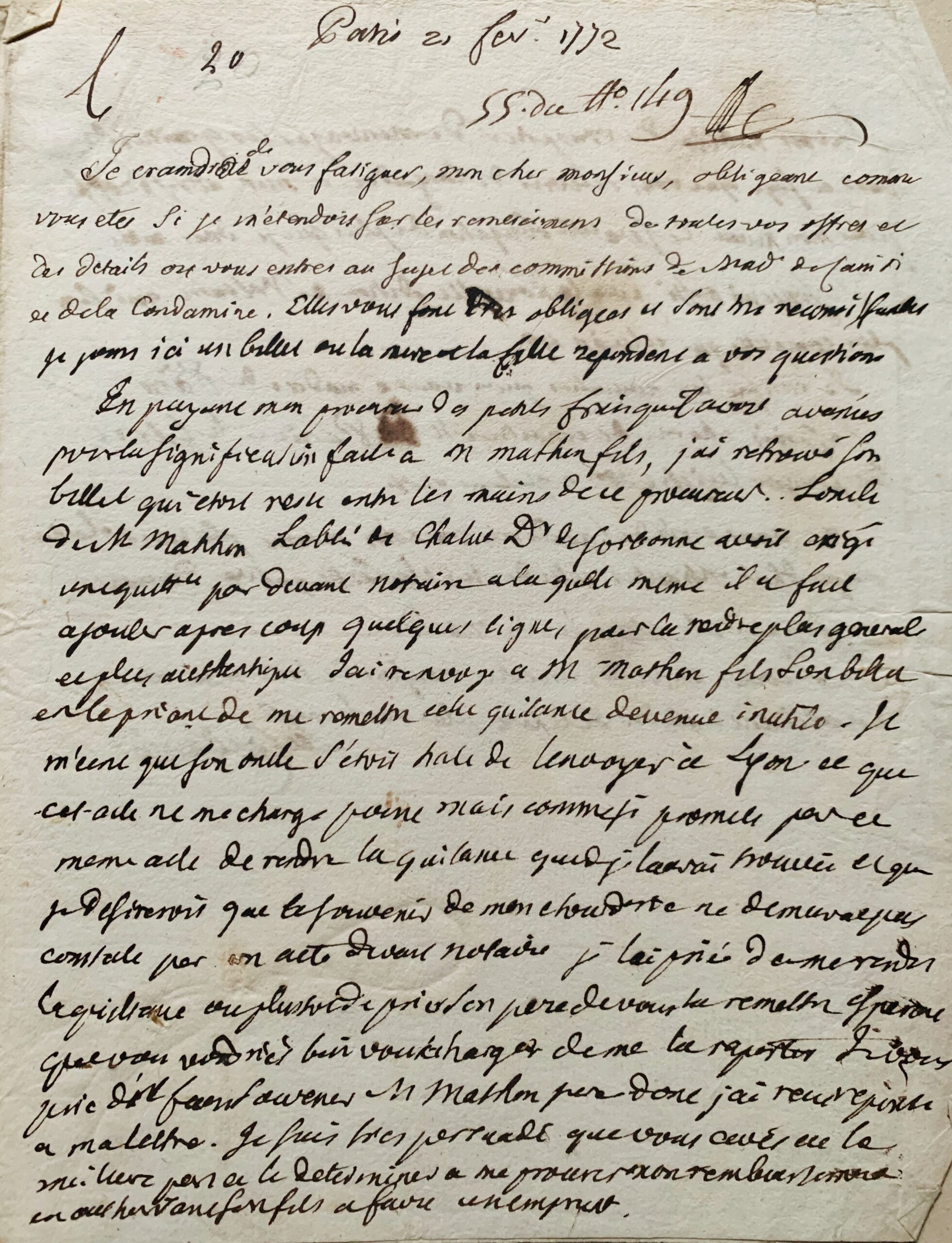 La Condamine remercie Quinson pour les commissions dont il s'est chargé pour mesdames de Cassini et de La Condamine. "Elles vous sont très obligées et sont très reconnaissantes. Je joins ici un billet où la mère et la fille répondent à vos questions". Il est ensuite question d'une affaire avec M. Mathon dont l'oncle, l'abbé de Chalut, Dr de Sorbonne, avait exigé une quittance devant notaire. "Il m'écrit que son oncle s'étoit hâté de l'envoyer à Lyon et que cet acte ne me charge point mais comme je promets par ce même acte de rendre la quittance quand je l'aurai trouvée [...] je l'ai prié de me rendre la quittance ou plutôt de prier son père de vous la remettre espérant que vous voudrez bien vous charger de me la rapporter [...].