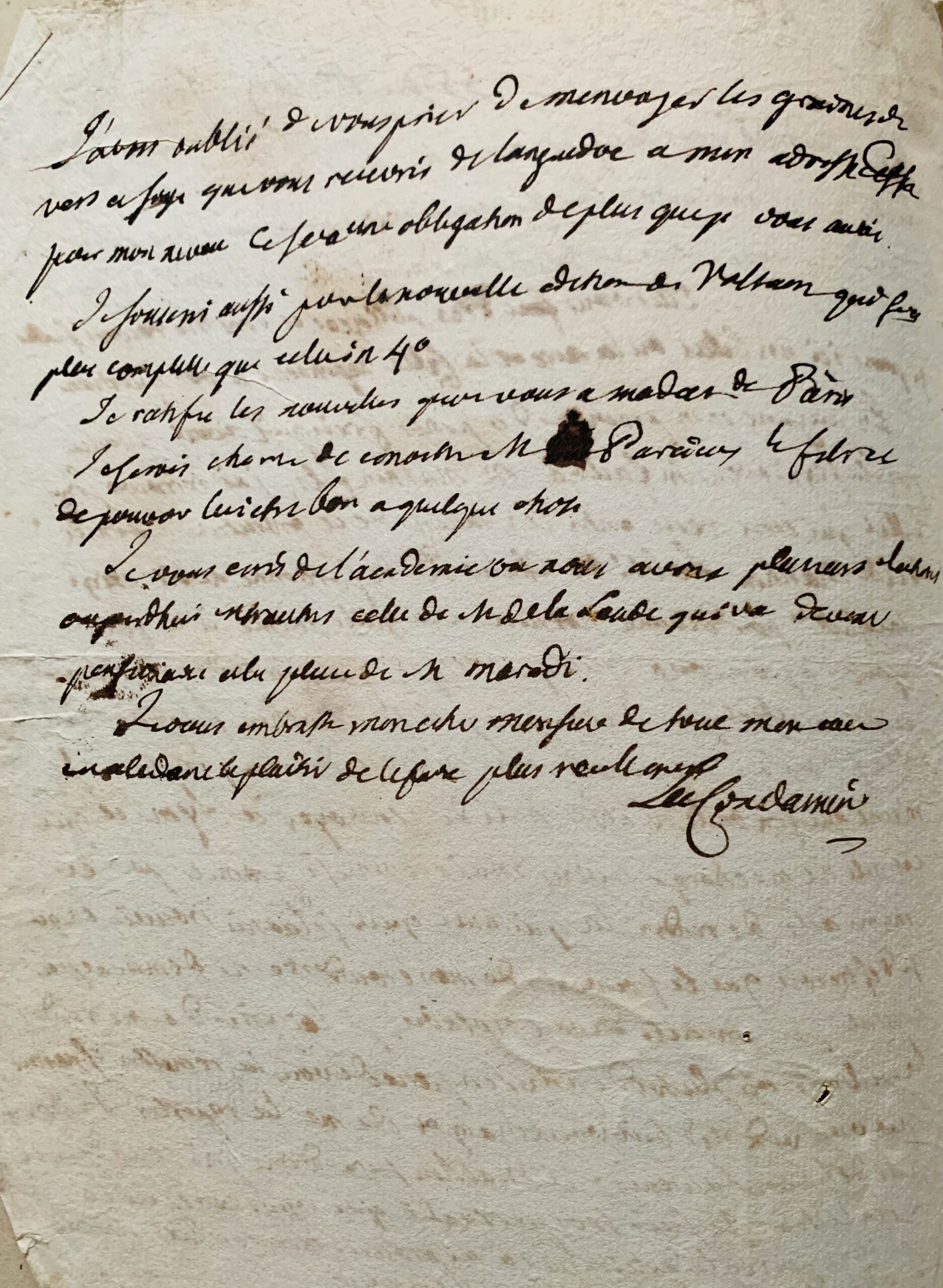 J’avois oublié de vous prier de menvoyer les graines de vers à soye que vous recevrés de Languedoc à mon adresse. C'est pour mon neveu, ce sera une obligation de plus que je vous aurai. Je souscris aussi pour la nouvelle édition de Voltaire qui sera plus complète que celle in-4° […]. Je vous écris de l’académie [des sciences] où nous avons plusieurs élections aujourd’hui entre autres celle de M. de La Lande qui va devenir pensionnaire à la place de Maraldi […]" [Lalande sera élu pensionnaire astronome de l'Académie des Sciences, le 28 février 1772, en remplacement de Giovanni Domenico Maraldi].