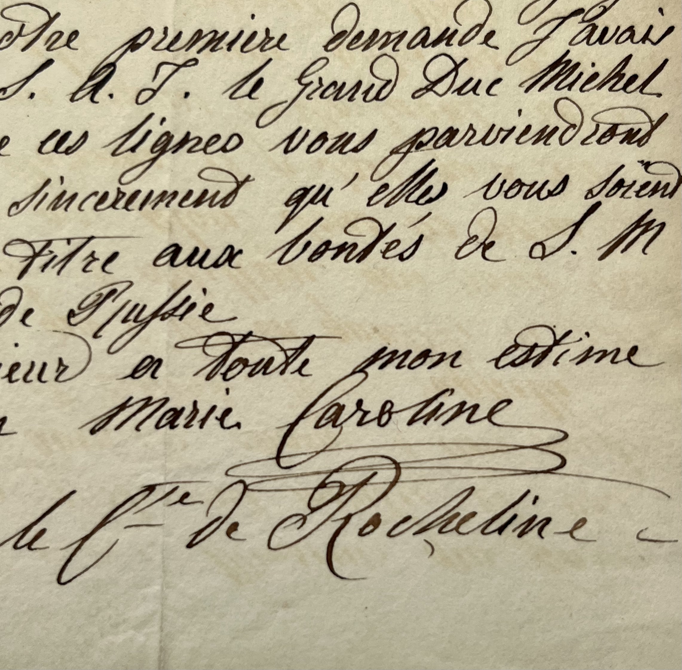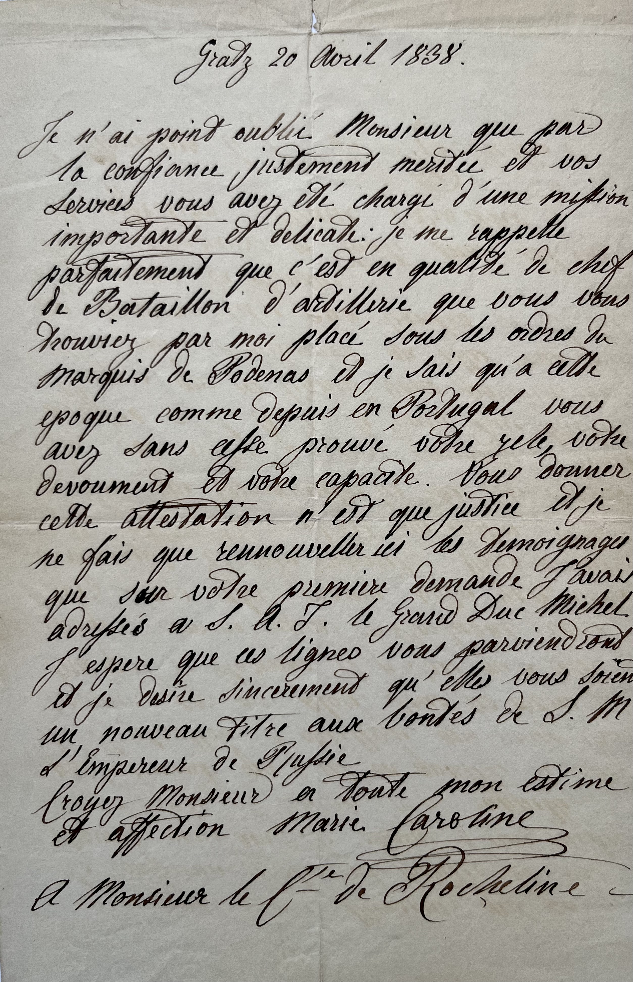 La duchesse de Berry atteste des bons services du comte de Rocheline pour le Tsar Nicolas Ier de Russie